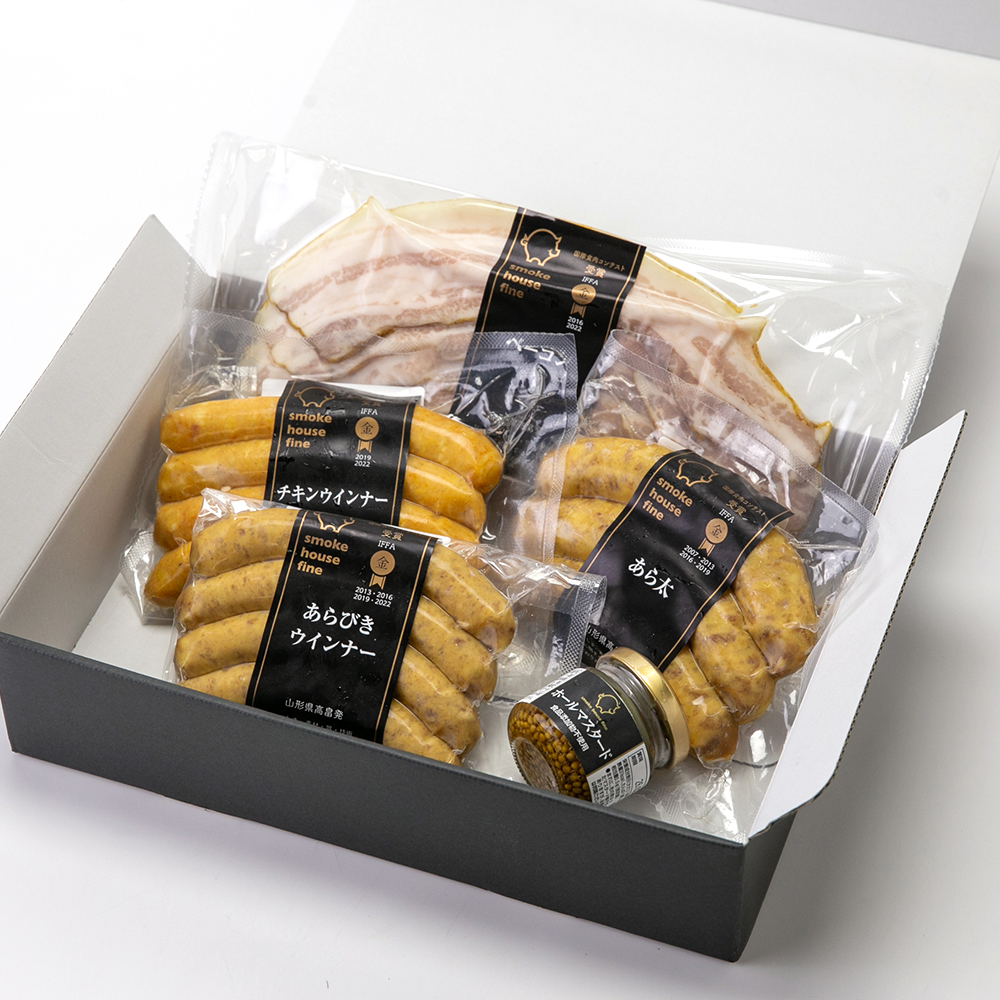 高畠町で、ハム・ソーセージ作りを行う「スモークハウスファイン」。鮮度抜群の国産豚肉を使用し、余計なものを入れない安心・安全の美味しさにこだわっています。今回、そんなスモークハウスファイン自慢の商品を贅沢に詰め合わせた、ギフトセットをご用意しました。ソーセージの本場・ドイツで開催された世界大会で、金賞を獲得したこともあるソーセージやベーコンは、どれもジューシーで、飽きのこない味わいが魅力。同梱されたオリジナルマスタードをたっぷり付けて、お召し上がりください。