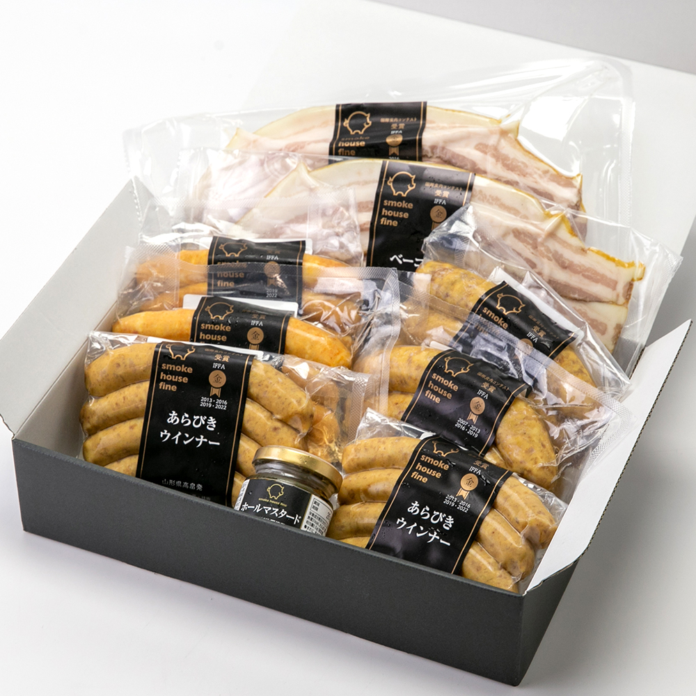 鮮度抜群の国産豚肉を使用し、安心・安全の美味しさにこだわって作られた、「スモークハウスファイン」自慢のソーセージとベーコンを、贅沢に詰め合わせました。ソーセージの本場・ドイツで開催された世界大会で、金賞を獲得したこともある、世界が認めた美味しさ。同梱されたオリジナルマスタードをたっぷり付けて、お召し上がりください。