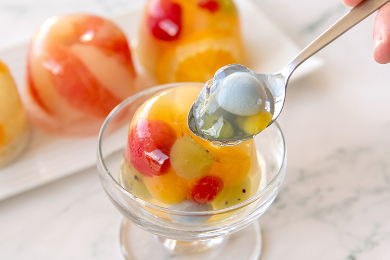 バニラ風味のゼリーの中に、カラフルなボール型のフルーツやゼリーを散りばめました。スイカ・洋梨・メロン・マンゴーなど、食感や味わいの違いも楽しいゼリーです。
