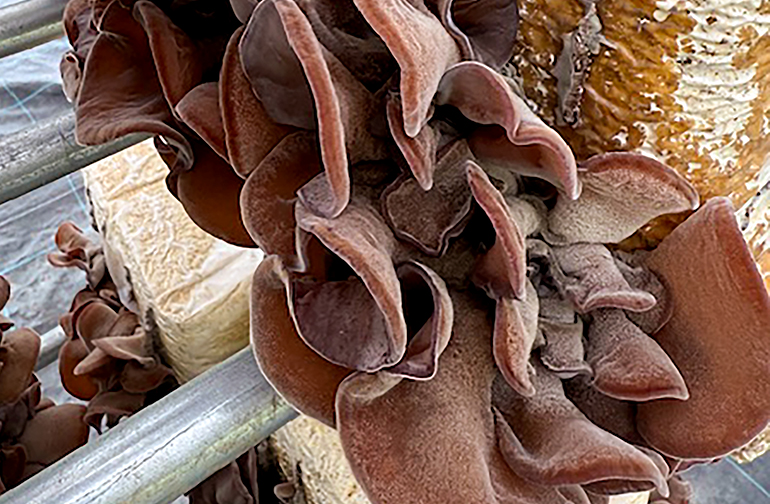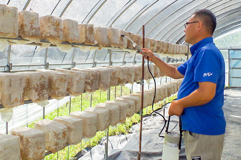 ファーグの主力商品は、きのこ。一年を通して、数種類のきのこを栽培している。「このあたりには、きのこ農家がほとんどありません。だから、地域の特産品になるようなきのこを作りたいと思ったのが、始めたきっかけの一つです」と、後藤さんは語る。中でも最も注力するのが、きくらげだ。栽培する場所は、森の環境を作り出したハウス。上面には遮光ネットを設け、森の中のような木漏れ日を再現。側面のビニールを開放することで、冷涼な風が吹き込み、夏でも暑くなりすぎない環境を作る。また、与える水は、山の岩間から湧き出る清らかな「桂清水」。菌床の状態を見ながら、手作業で散水する。できる限り自然に近い環境の中で育ったきくらげは、大きく肉厚でプリプリ。一度料理に使った客の多くがリピーターになり、旅館や小料理屋からも引き合いがあるという。「学校給食にも採用されるようになりました。『きくらげといえばファーグだよね』と言ってもらえるようになることが目標です」と、後藤さんは笑顔を見せた。