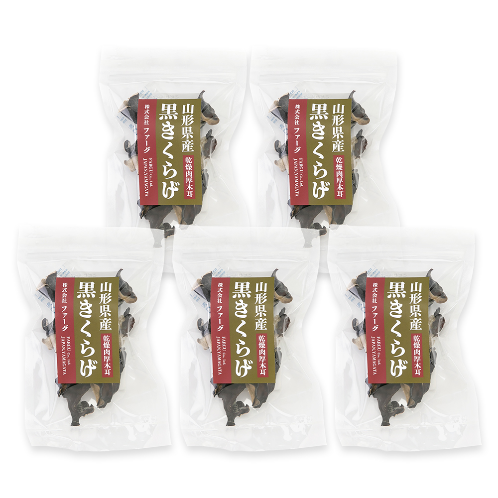 南陽市のファーグは、きのこをメインに栽培する農家。今回は「乾燥きくらげ」をご紹介します。置賜産の木材から作る菌床を使用して、自然豊かな南陽市のハウスで育てた、貴重な「純国産」です。菌床から最初に収穫される、サイズが大きくて肉厚な「一番どり」のものだけを厳選しました。プリプリ・コリコリとした食感を存分にお楽しみください。水で戻せばいつでも手軽に使えるので、毎日の料理に重宝しますよ。