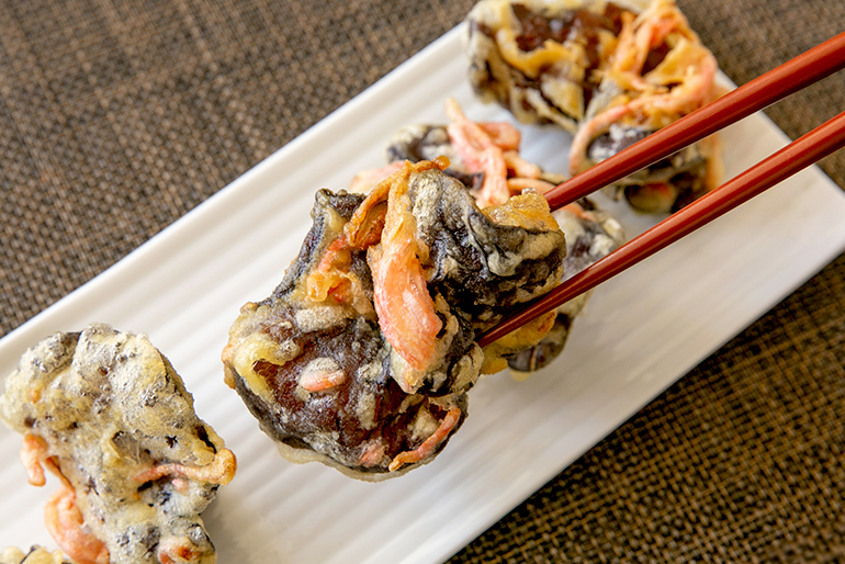 今回作るのは、後藤さんおすすめの「きくらげと紅生姜の天ぷら」。きくらげは、十分に浸かるくらいの水(またはぬるま湯)に入れて1時間以上置いて戻しましょう(約10倍に戻ります)。千切りにした紅生姜を混ぜた天ぷら衣をつけて、カラッと揚げていきます。「ポイントは、『天ぷら衣を濃いめに作ること』と『きくらげに少し切れ目を入れること』です。衣が絡みやすくなるんですよ」と、後藤さんは教えてくれました。