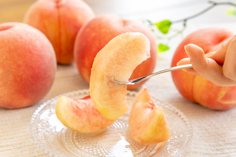 パリパリとした硬めの歯ごたえと上品な甘みが魅力の白桃。追熟しても柔らかくなりにくく、日持ちがするのも特徴です。
