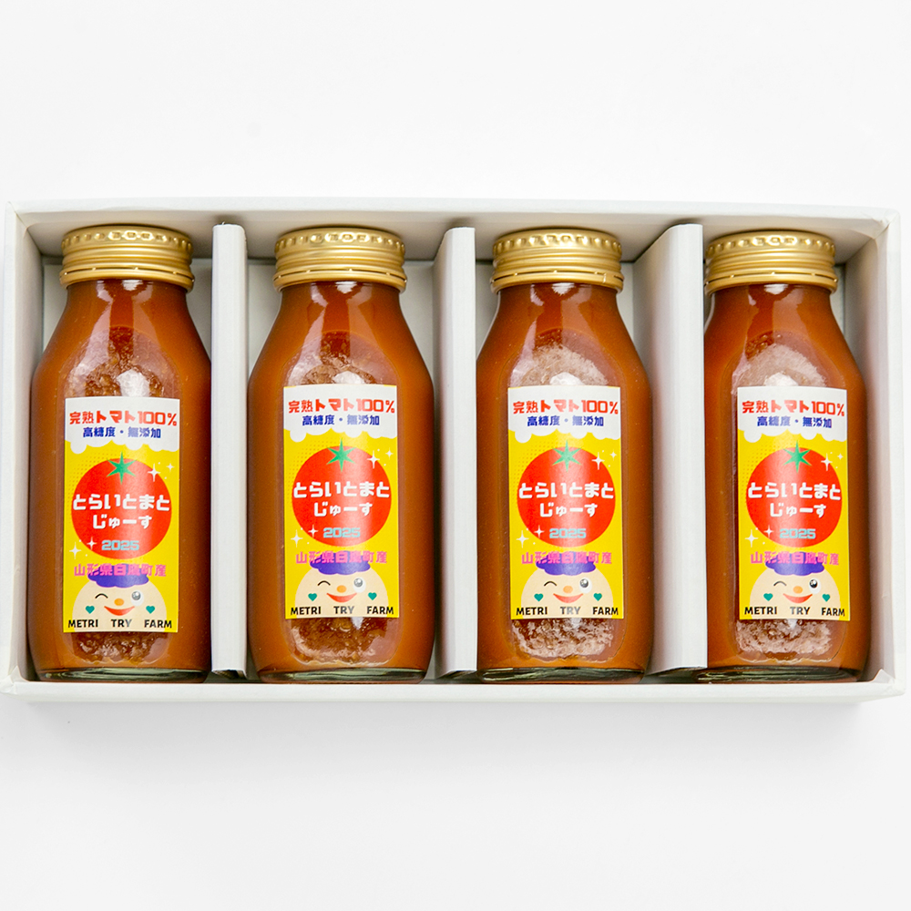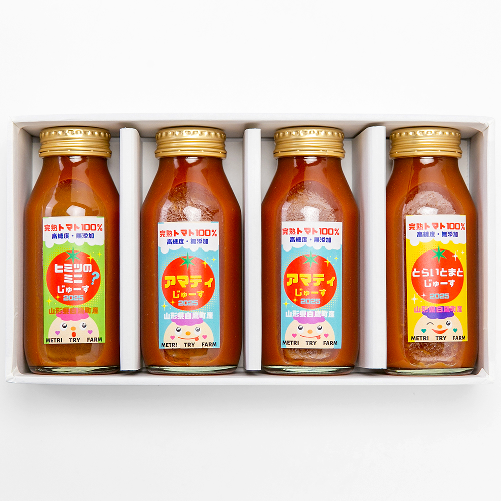 白鷹町の「METRI TRY FARM(メトリトライファーム)」は、自社で開発した農業用の給液装置を使って、野菜や果物の養液栽培に取り組んでいます。今回は、自家栽培しているトマトで作った「トマトジュース」をご紹介します。ラインナップは、フルーツトマト・ミニトマト・大玉トマトをそれぞれ使用した3種類。塩などを加えずにトマトだけで作ったジュースは、フレッシュで飲みやすく、自然な甘みが自慢です。飲み比べを楽しめる3種セットもご用意しています。