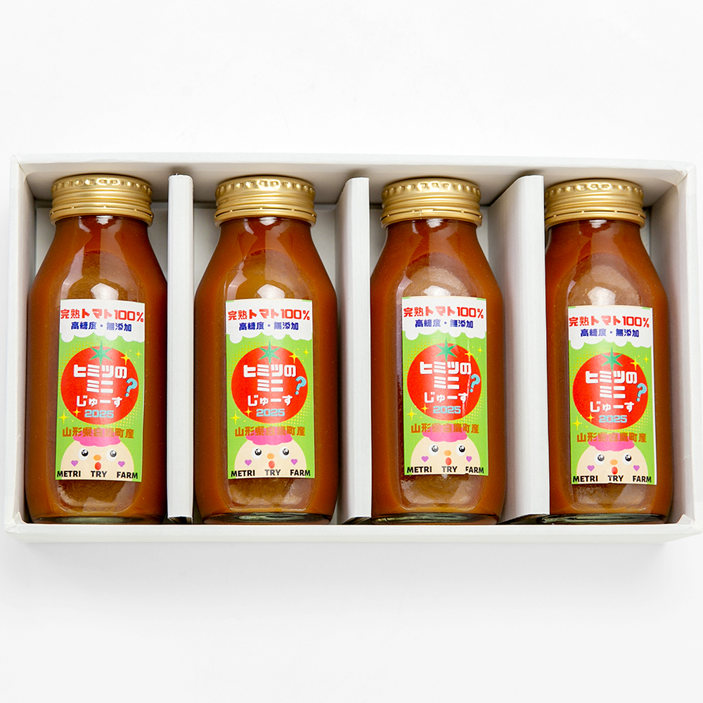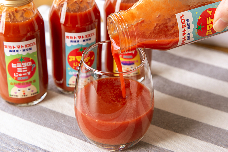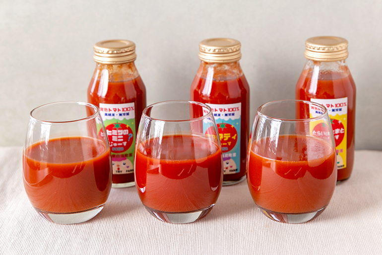 自社ブランドのミニトマト「ひみつのミニ」で作る、雑味のないクリアな味わいのトマトジュース。薄皮のミニトマトならではの軽やかさと、スイーツのように際立つ甘みが魅力です。