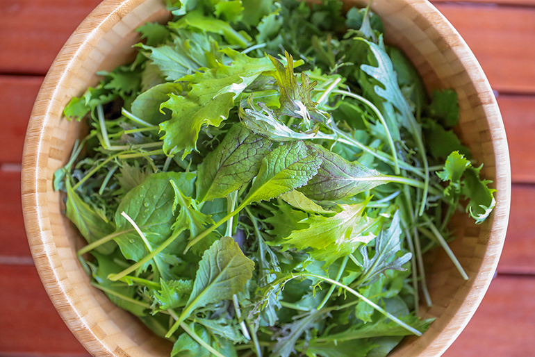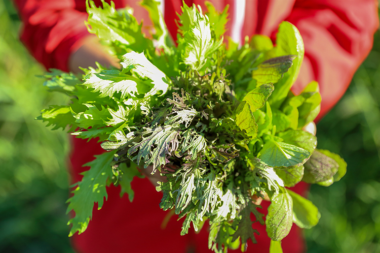 美味しいベビーリーフを栽培するために大切にしているのが、地域の資源を活かした「土づくり」だ。なめこの廃菌床や籾殻、堆肥などを配合し、微生物が活発に活動する豊かな土壌を整えている。繊細なベビーリーフは湿気に弱いため、ハウス内をこまめに換気し、常に風通しの良い環境を維持。種を撒き、芽が出るまでは土の状態を毎日観察し、少量の水を丁寧に与えて発芽を促していく。「本葉」がしっかりと広がり、ぐんと力強く成長し始めたら、水やりをあえてストップさせるそう。適度なストレスをかけることで、病気を防ぎながら葉の一枚一枚に旨みをぎゅっと凝縮。植物の状態に合わせた管理を行うことで、えぐみが少なく濃厚な味わいに育て上げている。
