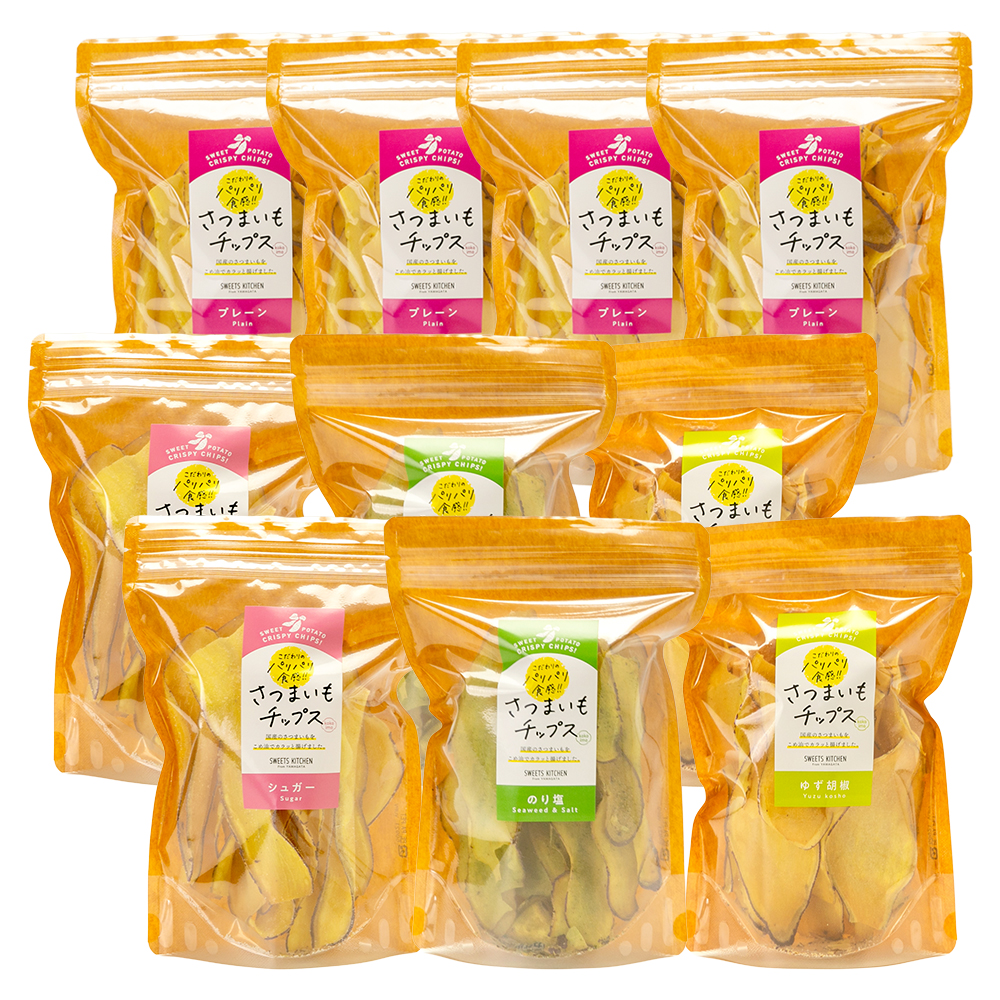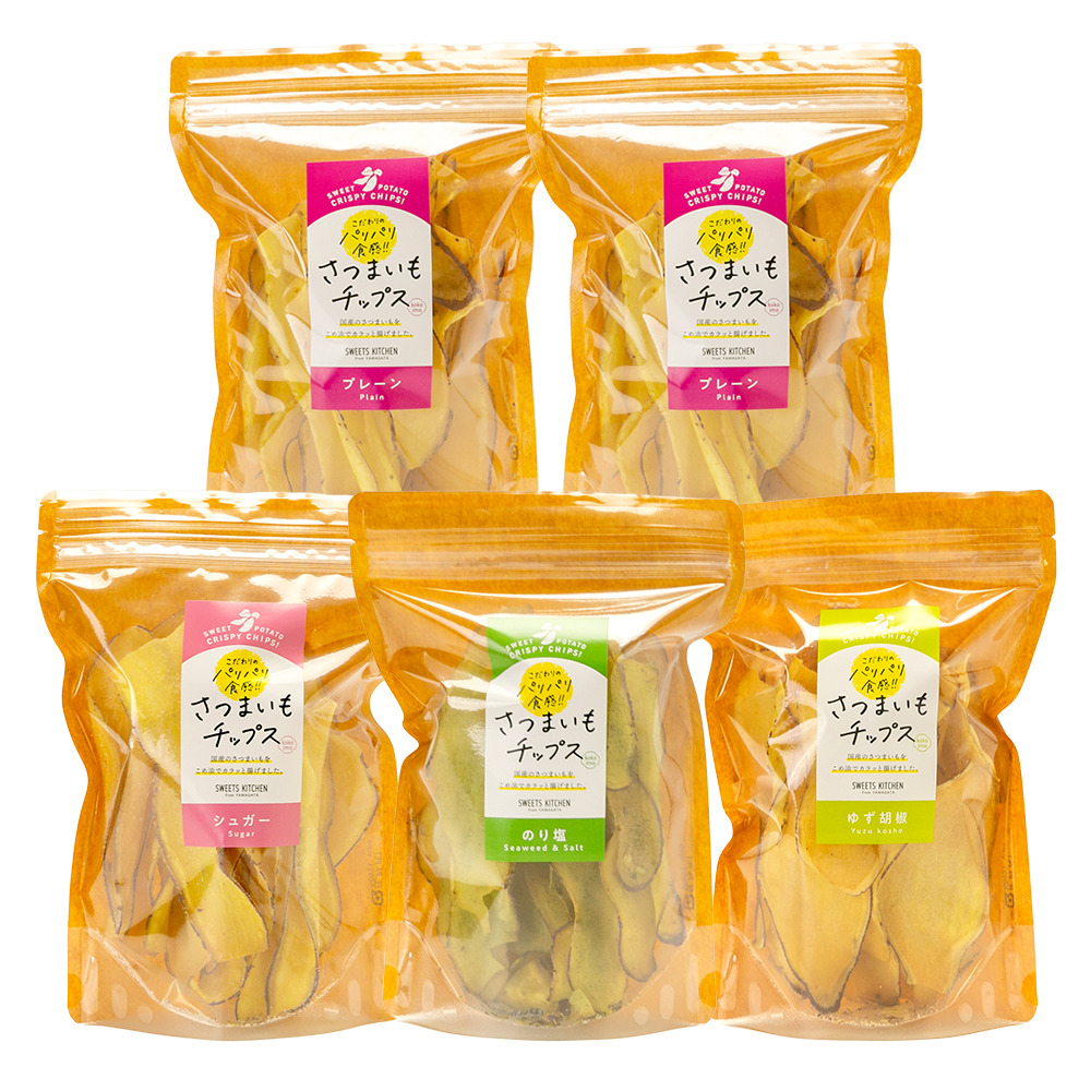 スイーツキッチンの人気商品「さつまいもチップス」。国産紅はるかをスライスし、丁寧に揚げています。ほんのりした甘さと、パリパリ食感を堪能できますよ。今回は4種類のフレーバーをご用意!