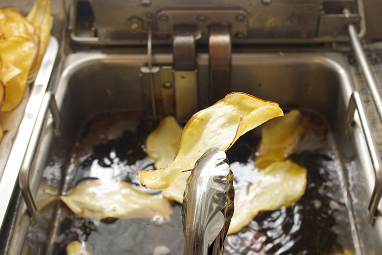 パリパリとした食感を生み出すため、さつまいもの「スライス幅」にこだわっています。「薄すぎると食べごたえがなく、厚すぎるとガリガリっとした食感になってしまんです」と、代表の森谷さん。パリッとした食感が活きる「1mm」にスライスしています。また、さつまいもを揚げる作業は、一枚一枚手作業で丁寧に揚げています。均一に火が入るよう、裏返したり、軽く抑えたりと細かい気配りが光ります。揚げ油は、天童市・三和油脂の「こめ油」を使用。味にくせがないので、さつまいも本来の風味と食感を最大限に引き出しています。
