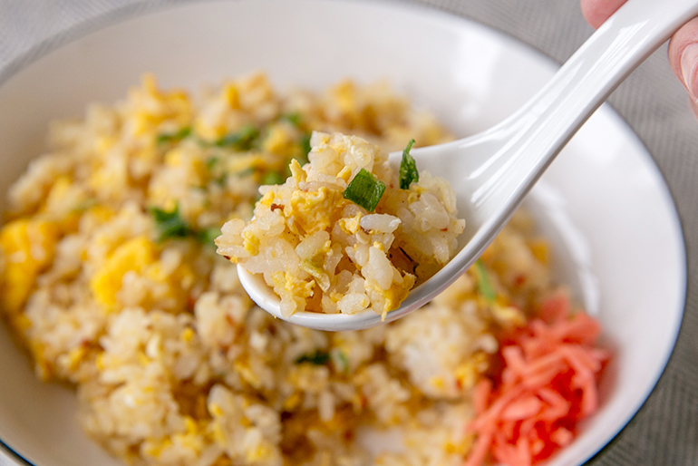 今回は「チャーハン」にして、いただきま~す!ぱくり……おぉ~、しっかりとした噛みごたえ!一粒一粒に上品な甘みがギュッと詰まっています。周りの食材の味を引き立てつつ、しっかりとお米の存在感も主張してくる味わいと食感にビックリ!