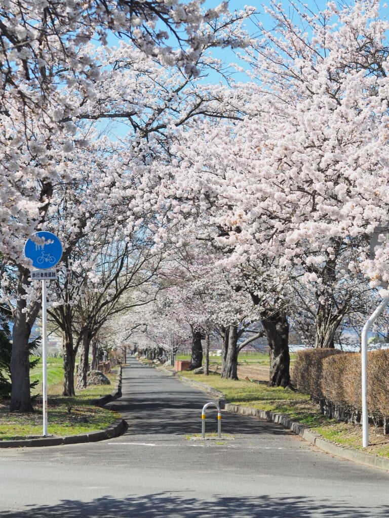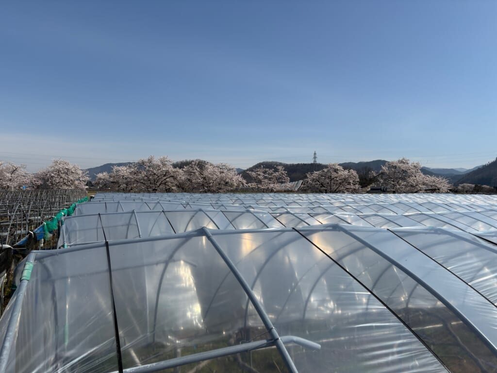 ぶどう園脇の遊歩道の桜が満開の日にハウス張りをしました。