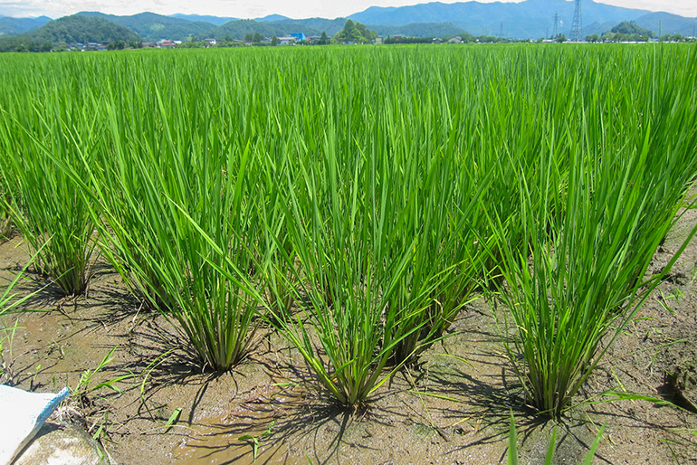 金子農園の田んぼを潤すのは、奥羽山脈から流れる屋代川と吾妻山にあるダムからの冷たく澄んだ水。このミネラル豊富な水と土壌の栄養をたっぷり吸収させるために行っているのが「疎植栽培」です。疎植(そしょく)とは、苗と苗の間隔を広くして田植えをすること。広々としたスペースでしっかりと根を張ることができ、力強い稲に成長します。苗の密度も減るので、日当たりや風通しも良くなり、病気になりにくくなるのも特徴。苗が健やかに育ち、おいしいお米が出来るんです。