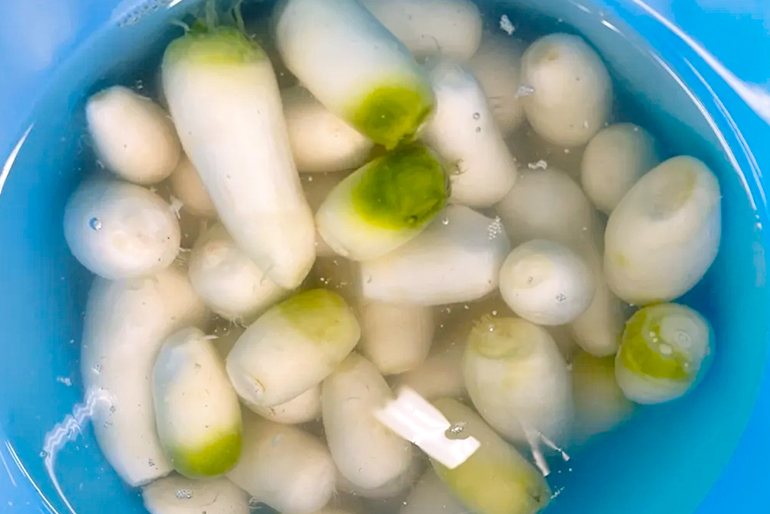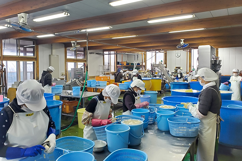 さとう農園の「洗い里芋」には、里芋専門店のこだわりが詰まっています。真っ白で美しい里芋に仕上げるため、専用の装置で洗浄。里芋同士をこすり合わせて皮をむいていきます。この洗いあがった里芋を、熟練の技で一つ一つ丁寧に手作業で確認。傷みや不要なところがないかを見極めていくんです。「里芋も人間と同じように顔も形も異なります。それぞれに合ったむき方をして、個性を引き出しているんですよ」と、佐藤さんは笑顔で話します。