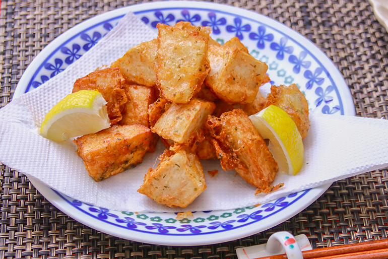 真空パックで届く「洗い里芋」は、500gと使いやすいサイズです。手間のかかる皮むき作業がないので、とっても楽ちん!食べやすい大きさに切って揚げていきますよ~。こんがりキツネ色になりました。