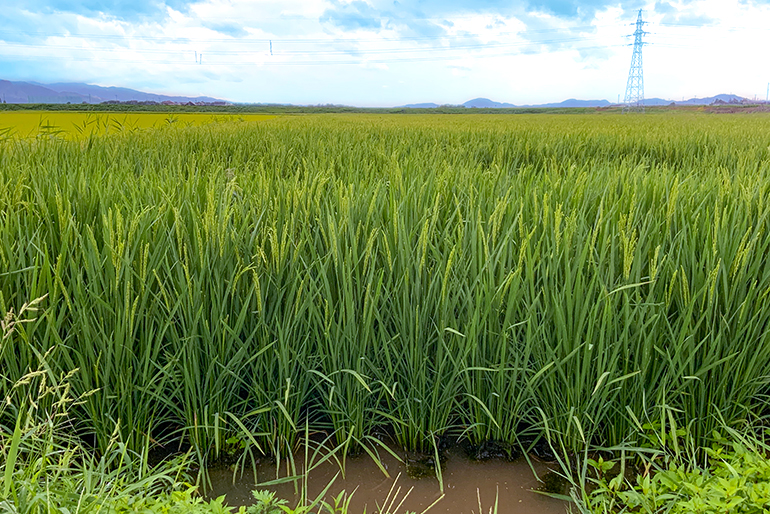鶴岡市羽黒町は、出羽三山(羽黒山・月山・湯殿山)の麓に位置する。山間部と平野部が混在し、豊かな自然に恵まれた地域だ。「出羽弥兵衛(でわやへい)」は、この地で200年以上に渡り、米や野菜、果樹の栽培に取り組む農家。栽培する米の品種は、つや姫や雪若丸、ササニシキをはじめ、もち米「でわのもち」、酒米「山田錦」など多岐に渡る。どれも香り、ツヤ、粘り、甘み、粒の大きさといった仕上がりは好評だ。その美味しさの秘密は、栽培している環境にある。夏は昼夜の寒暖差が大きい気候の羽黒町。日中は照りつける太陽の光を受けて気温が上がり、夜は山から吹き下ろす涼しい風によって下がる。この昼夜の寒暖差が米に甘みを与える。さらに、出羽三山や朝日連峰に囲まれる羽黒町は、水資源に恵まれている。山々から流れ込む、ミネラル豊富な水をたっぷり吸収し、旨みを強く感じる米に成長する。