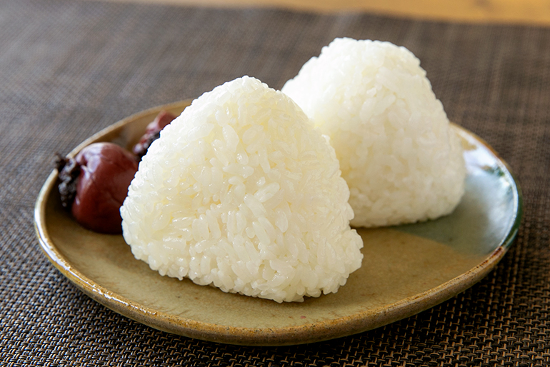焼き魚や煮物など、和食のおかずと合わせるのにぴったりな「つや姫」。粒立ちが良く、冷めても美味しいため、おにぎりにもおすすめです。朝に握った「塩むすび」をいただきま~す。