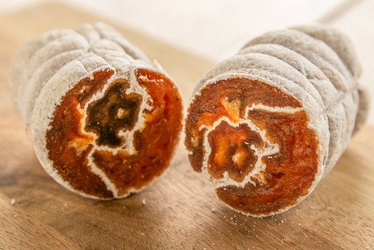 堀農園では、柿を使った2種類の加工品にも力を入れている。まず一つが「あんぽ柿」だ。「柿を収穫すると、必ず傷モノができてしまいます。その柿を活用して試しに干し柿を作ったのが、始めたきっかけです」と、堀さんは語る。あんぽ柿は、皮を剥いた柿を熱風乾燥させて作る。じっくりと時間をかけて乾燥させることで、凝縮した甘みに仕上がるという。また、水分量を32%ほど残すのが、堀さんのこだわり。ほど良い水分量が、口の中でとろけるような、柔らかな食感を生む。そしてもう一つの加工品が、「柿巻」。複数個の干し柿を組み合わせて紐で巻き、棒状に成型した商品だ。こちらは熱風乾燥で水分量を26%程度まで減らし、さらに自然乾燥で仕上げた干し柿を使用する。「この方法だと、外側に白く結晶化した糖分がつくので、よりしっかりと甘みを感じられるんですよ」と、堀さん。柿巻の魅力は、カットすると現れる、花のような美しい断面。きちんと綺麗な断面になるよう、一つ一つ手作業できつく縛り上げることが重要だという。堀農園ではこうした加工品を、毎シーズン製造。地元の土産物店などで販売され、人気を集めている。