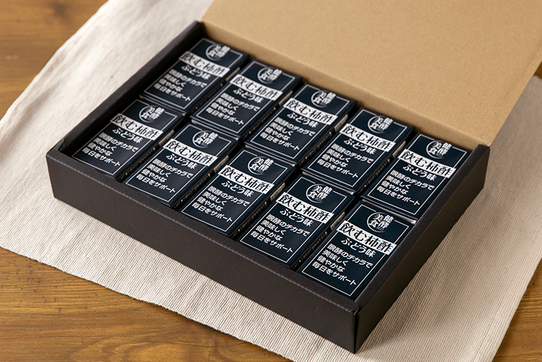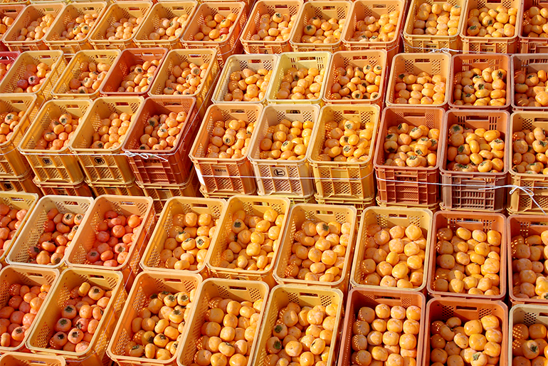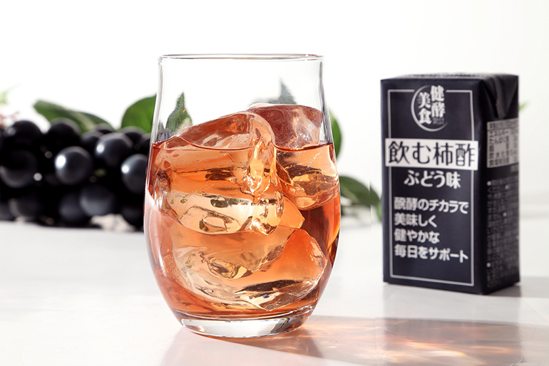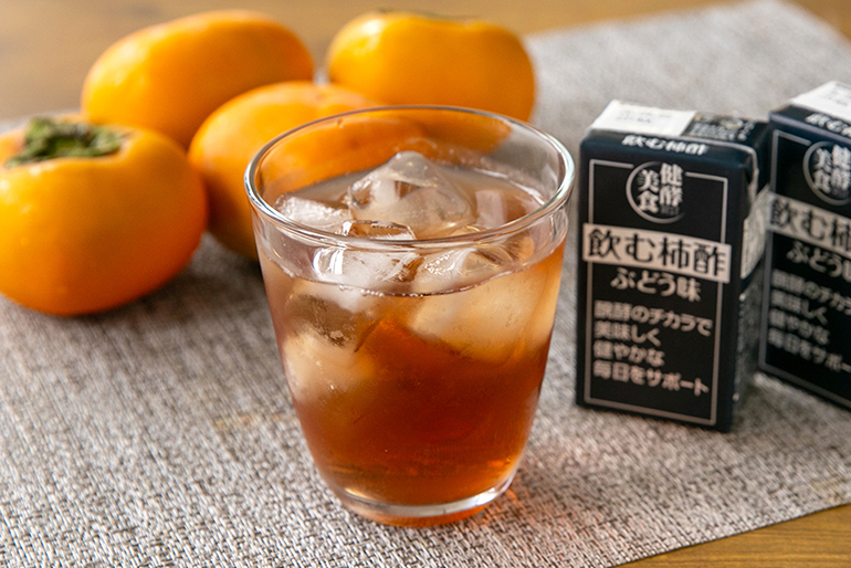 庄内地方をはじめ、県産食材にこだわった発酵食品を製造する、マルノー山形。果実酢は、庄内の特産品を原料に製造している。主力商品の一つ「柿酢」は、地元の特産品「庄内柿」をたっぷり使用。製造工程にも、時間と手間を惜しまない強いこだわりが見える。秋に収穫した庄内柿は、皮やヘタがついたまま樽の中で、約3〜4ヶ月置く。柿の重さを利用して果汁を出すことで、柿の旨みをたっぷり抽出できるそうだ。その後、酵母菌と酢酸菌による発酵が行われ、仕込みから1年かけて柿酢を作っていく。風味をよくするため、さらに1年熟成させることがポイント。「2年という時間をかけることで、まろやかで芳醇な柿酢になってくれるんです」と岩崎さん。こだわりの製法で作った「柿酢」に、濃縮ぶどう果汁やはちみつなどを加えた「飲む柿酢 ぶどう味」も幅広い世代に好評だ。