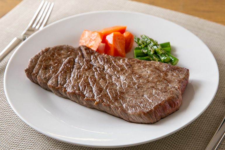 肉の大場で取り扱う牛肉は、A5ランク雌牛の「米沢牛」。米沢牛は、神戸牛や松阪牛などと並ぶ、人気のブランド和牛のひとつで、置賜地方の寒暖差が生む「きめ細かな肉質」と「まろやかな脂の甘み」が特徴だ。中でもA5ランクは、脂肪交雑・肉の締まりやきめ・色沢など、すべての評価基準で最高等級を満たしたもの。さらに、雌牛は雄牛より脂の融点が低く、口に入れた瞬間にとろけるような柔らかさと、上品な甘みを持っている。リピーターからは、「脂が軽くて香りが良い」「たくさん食べても、食べ疲れしない」といった声が多いという。そんな米沢牛は、月に数回ほど、信頼のおける仲買人からブロックで仕入れている。「カットの仕方によっても美味しさが変わってきます。それぞれの部位によって、最適な厚さ・大きさにカットしてお客様に提供しています」と、義則さんは胸を張る。