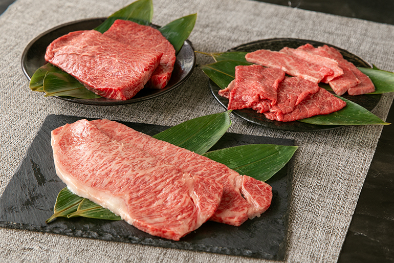 今回は、サーロイン(ステーキ用)、カルビ(焼肉用)、もも(ステーキ・焼肉・すき焼き用)、切り落としをご用意。部位や用途に合わせて、最適な厚さや大きさにカットしてお届けします。肉の大場のモットーは、「何よりも肉の鮮度と品質を重視すること」。そのため、注文を受けてからカットし、冷蔵便で発送することにこだわっています。「冷凍すると、解凍時にドリップが出てしまいます。旨味が逃げてしまう原因になるんですよ」と、2代目・大場さんは教えてくれました。