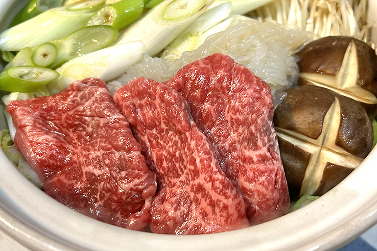 すき焼き用に薄切りにしたもも肉は、舌の上でとろけるような食感です。すき焼きはもちろん、しゃぶしゃぶにも使えます。