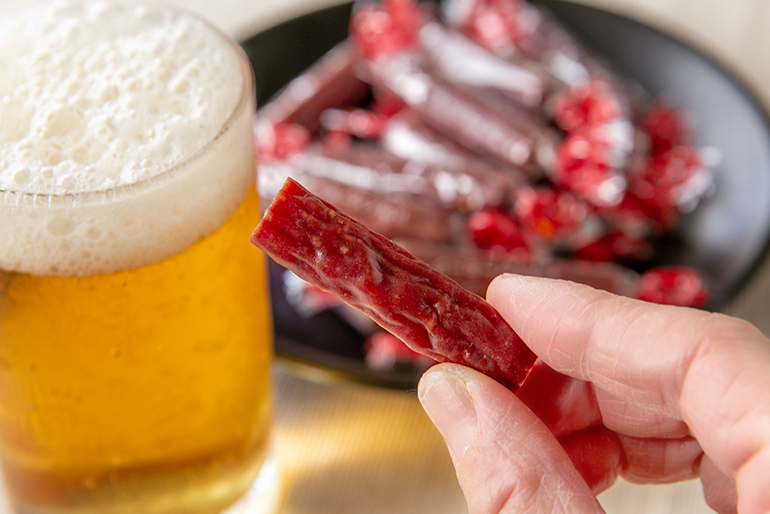 包みを開けると、豊かな燻製香が広がりますね。ぱくり……。おお~、クセがなくて食べやすいですね!嚙むほどに馬肉の旨味が広がります。脂身が少ないので、あっさりとした食べごたえです。ここでビールを……。う~ん、燻製の香りとほど良い塩気が、ビールと相性抜群です!