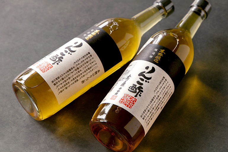 本格醸造りんご酢の原材料は、りんご果汁のみ。まず県内産りんごを細かく砕き、重しをかけて丁寧に絞ります。絞った果汁を、りんごに付着した自然由来の酵母の力でアルコール発酵。そこに酢酸菌を加えて酢酸発酵させ、りんご果汁100%のお酢をつくります。これをさらに、3年間熟成させるのだそう。「じっくりと熟成させることで、芳醇な風味が生まれ、酸味がまろやかになるんです。一般的なりんご酢と一線を画す美味しさですよ」と、渡辺さん。食にこだわりのある方や健康に気を遣う方への贈り物にも重宝する一品です。