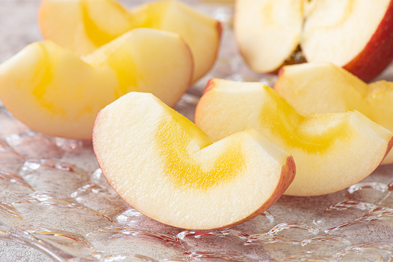 船中農園のもう一つのこだわりは、栽培方法にある。りんごを含めた多くの果物は、果実が育つ過程で袋をかぶせる「有袋栽培」という方法で育てられている。それに対し、船中農園では袋をかけない「無袋栽培」を取り入れている。太陽の光をたっぷり浴びることで、果肉の中には蜜がぎっしり詰まるそう。甘みが強いだけでなく、酸味とのバランスが良くなるのも特徴だ。「『美味しい』とか、『また食べたい』と言ってもらいたい。その一心で愛情込めて育てています」と、笑顔を見せる。
