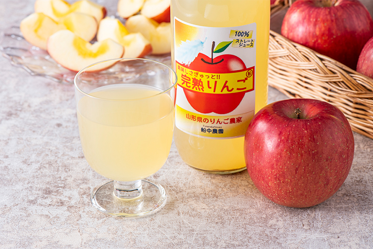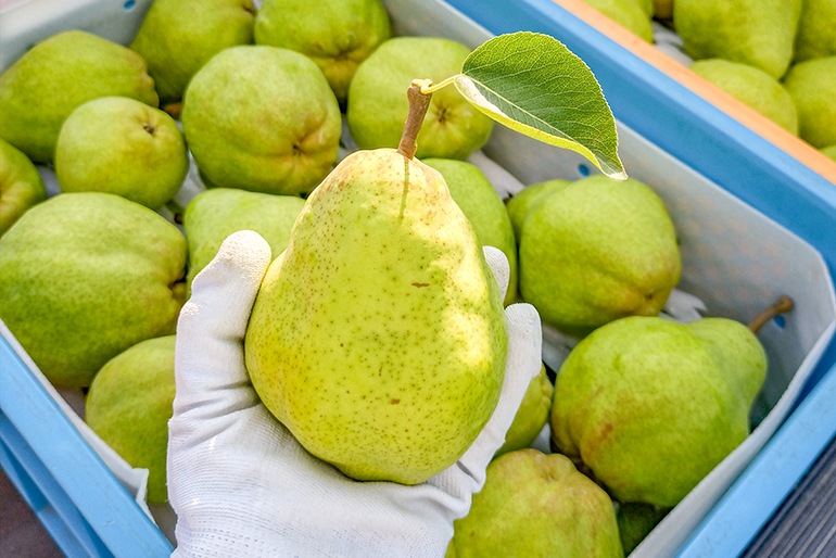 置賜盆地の北部に位置する南陽市。白鷹丘陵のなだらかな山並みに囲まれ、南端には最上川が流れる地域だ。盆地特有の昼夜の寒暖差が大きい気候を活かした果樹栽培が盛んな地域。さくらんぼ、ぶどう、りんご、ラ・フランスなど多くの果物が生産されている。この地で、果樹専門の農園を営む「船中(ふななか)農園」。りんごの栽培をメインに、ラ・フランスとさくらんぼを育てている。「自分が美味しいと思う納得のいくものを消費者に届けたいという思いで、果物と向き合っています」と、代表の船中信孝さん。りんごの選果には特にこだわりを持ち、すべて手作業で行っている。確かな目利きで一玉一玉を見定めるだけでなく、手にしたときの重さや質感、音を頼りにして、蜜が入ったりんごを丁寧に選り分けているそうだ。