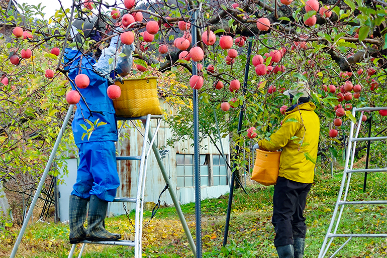 りんごを含めた多くの果物は、果実が育つ過程で袋をかぶせる「有袋栽培」という方法が一般的。それに対し、船中農園では、袋をかけない「無袋(むたい)栽培」で育てています。太陽の光を強く浴びることで、美味しいりんごの証である「蜜」が入りやすくなるそう。甘みが強いだけでなく、酸味とのバランスが良いのも特徴です。さらに、りんごの選果はすべて手作業で行っている。「手にしたときの重さや質感、音を頼りにして、蜜が入ったりんごを丁寧に選り分けています」と、代表の船中さん。長年の経験に基づく確かな目利きで、一玉一玉を見定めている。