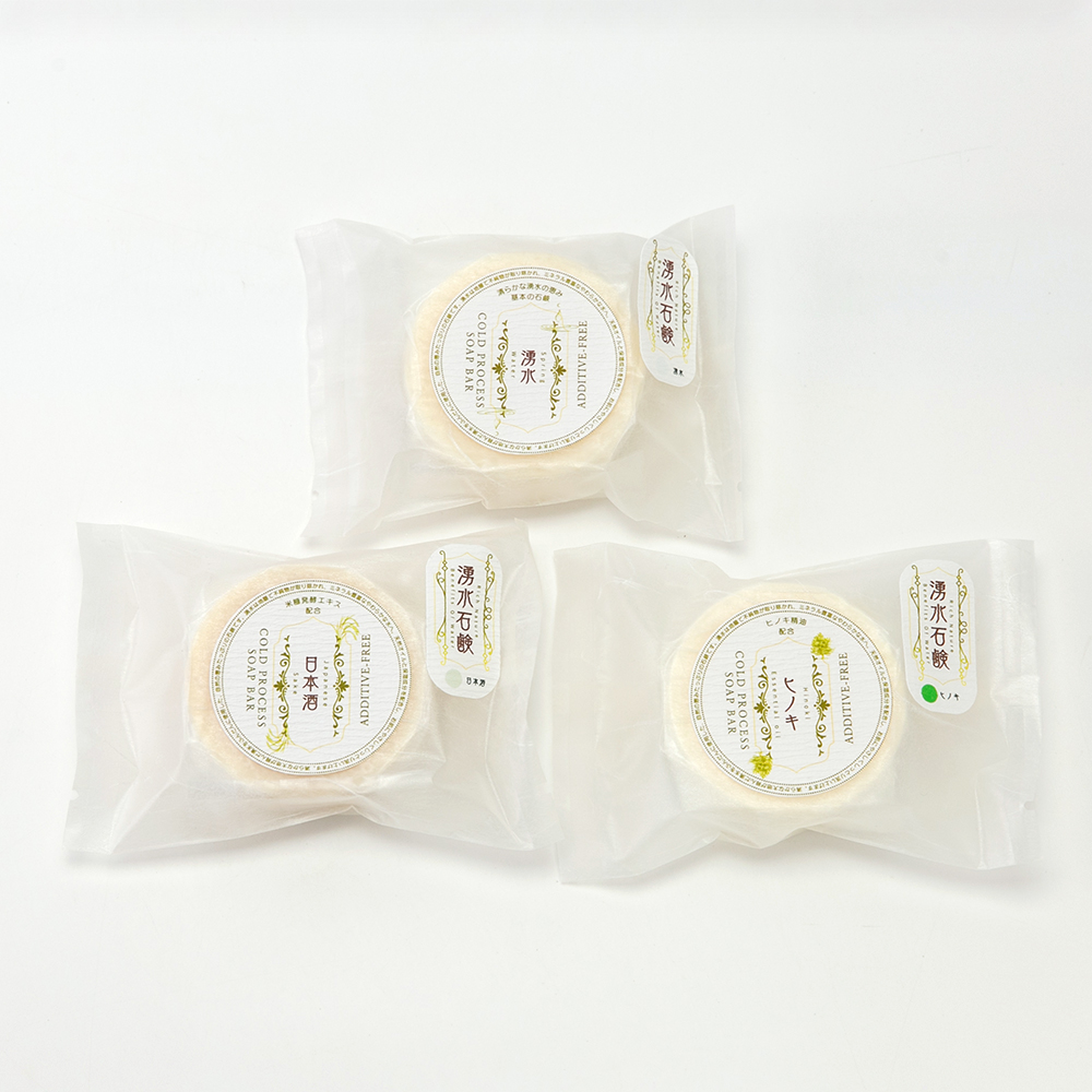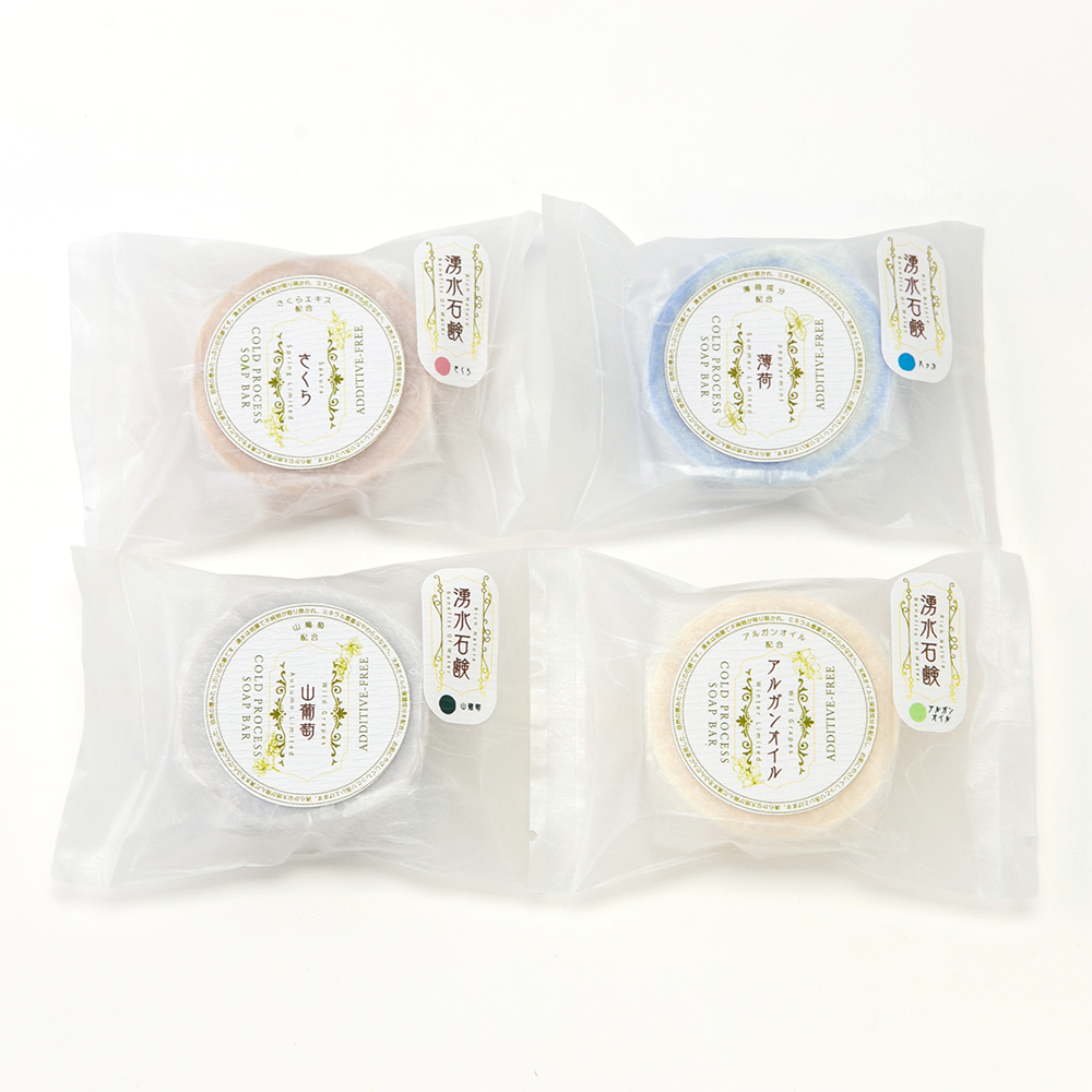 山形の自然素材を活かしたスキンケア製品を手がける「水進化粧」の代表商品「湧水石鹼」。地元の里山「雪の観音郷」の湧水をベースに、天然由来の植物オイルや保湿成分を配合しました。ラインナップは、定番の「湧水」をはじめ、香り豊かな「ラベンダー」「カモミール」、山形の特産品を取り入れた「最上紅花」「さくらんぼ」などをご用意。