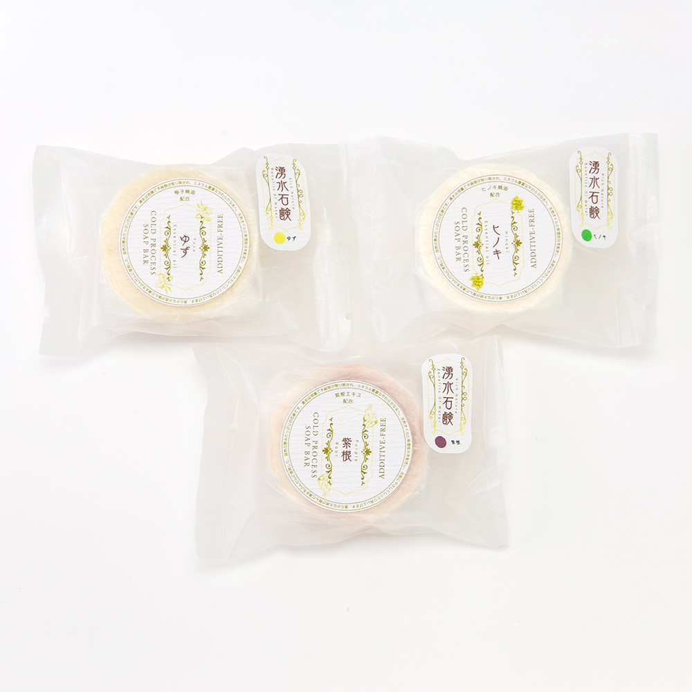 山形の自然素材を活かしたスキンケア製品を手がける「水進化粧(すいしんけしょう)」。手間ひまを惜しまず、素材の良さを最大限に引き出した製法にこだわっています。今回ご紹介するのは、代表商品「湧水石鹼」。地元の里山「雪の観音郷」の湧水をベースに、天然由来の植物オイルや保湿成分を配合しました。ラインナップは、定番の「湧水」をはじめ、香り豊かな「ラベンダー」「カモミール」、山形の特産品を取り入れた「最上紅花」「さくらんぼ」などをご用意。3~4種類をセットにしてお届けします。
