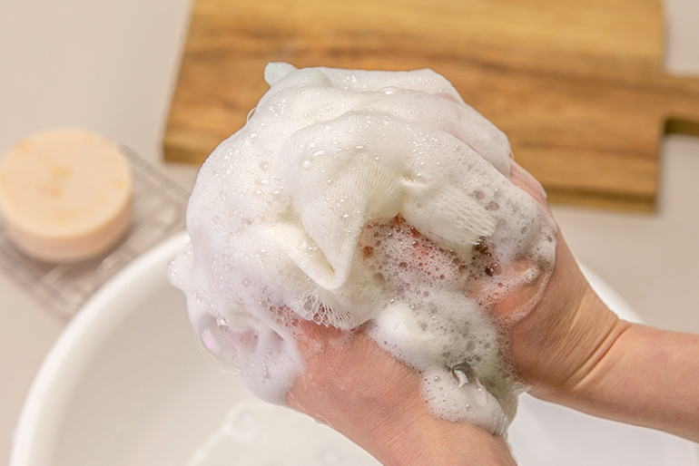 湧水石鹸を手にとってみると、コールドプロセス製法ならではの、素朴で温かみのある手触りです。泡立てネットを使うと、あっという間にきめの細かいクリーミーな泡が完成しました。