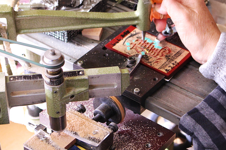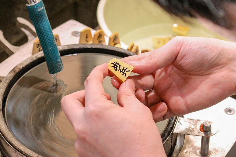 こちらの将棋駒は、専用の機械を用いて、一駒ずつ手動で文字をなぞって彫っています。木地に直接文字を書き込む「描き駒」に対して、手間と時間がかかります。