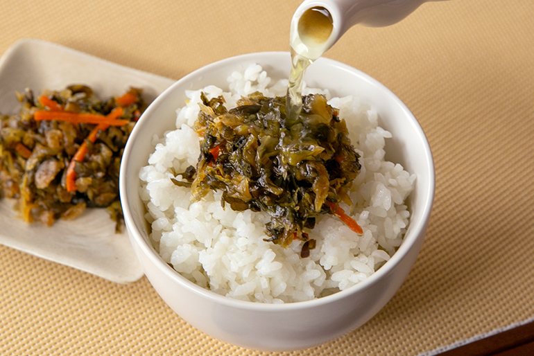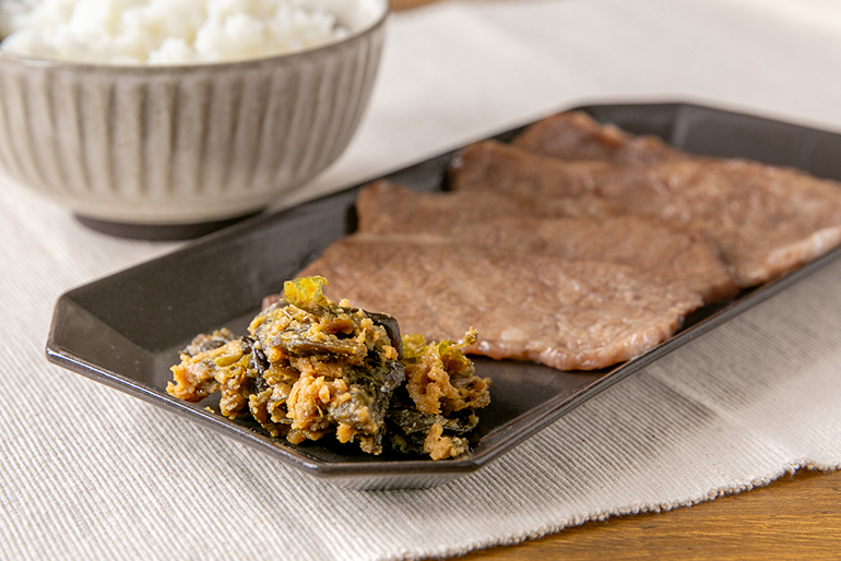 三奥屋(みつおくや)は、高畠町で70年以上続く漬物の老舗。古くは味噌や醤油の醸造を行っていたが、1948(昭和23)年に漬物専業となり、事業を開始した。漬物屋を始めた背景には、先代の「農業を中心に地域を盛り上げたい」という想いがあった。工場長の鈴木吉弘さんは「雪深い山形には、保存食としての漬物文化が根付いています。地場で作られる美味しい野菜を漬物に加工することで、地域の農業や文化を活性化させることが出発点だったんです」と、教えてくれた。その創業精神を受け継ぎ、おみ漬け・青菜(せいさい)漬け・赤かぶ漬けなど、地元・置賜地方や県内産の野菜を取り入れた、さまざまな漬物を展開している。「創業当初からの理念に『漬け物の味はまごころの味、愛情の味』というものがあります。人の手をかけて、丹精込めてお作りしています」と、鈴木さんは語る。