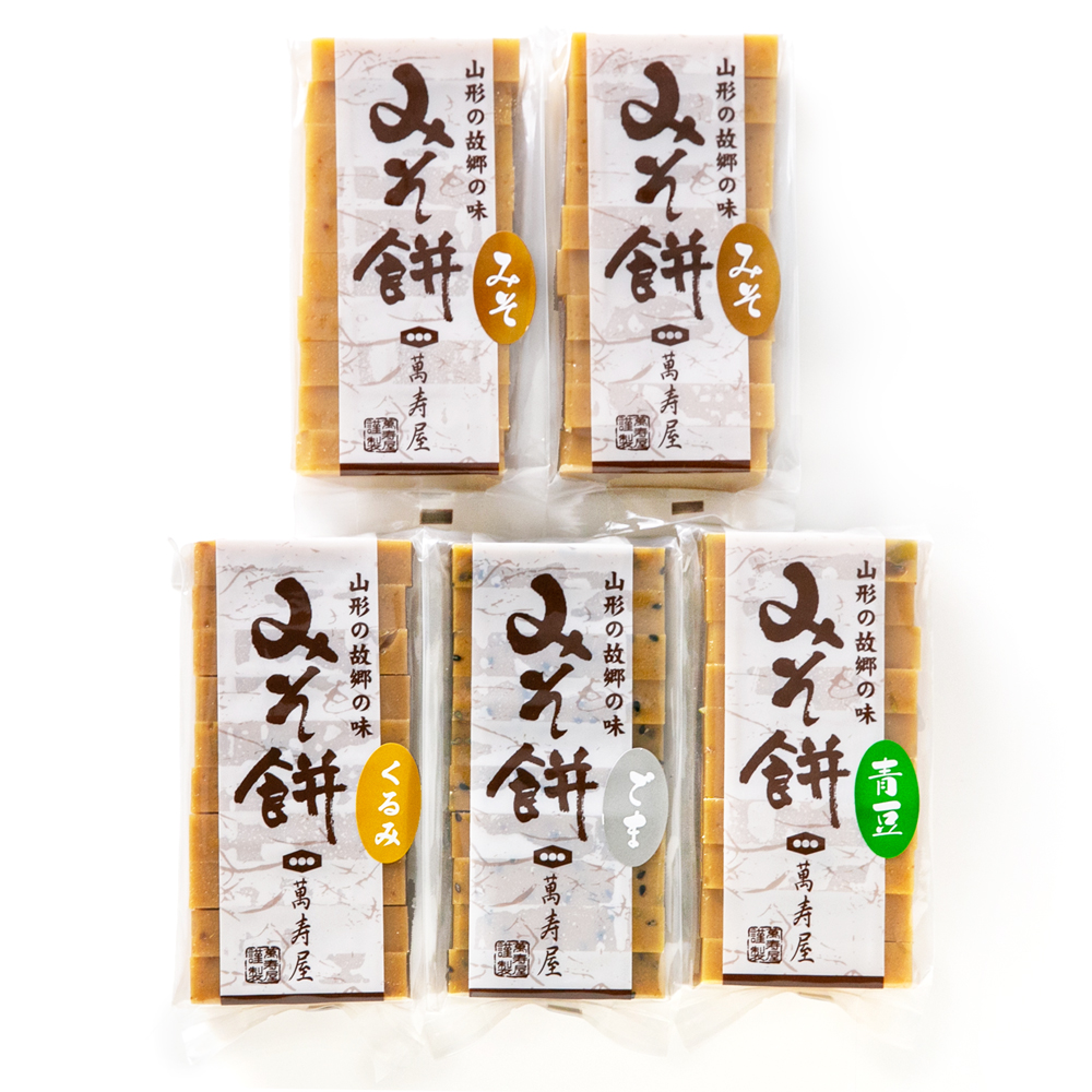 萬寿屋本舗は、長井市を代表する餅と和洋菓子の専門店。今回ご紹介するのは、置賜地方に古くから伝わる故郷の味「みそ餅」。つきたての餅に自家製味噌と砂糖を丁寧に練り込み、甘じょっぱい独特の風味を加えて仕上げた餅です。シンプルな「みそ味」のほか、くるみ・ごま・青豆入りをラインナップ。お餅にあらかじめ味がついているため、焼くだけで、最高のおやつが出来上がります。