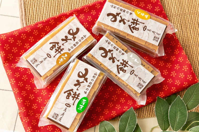 萬寿屋本舗は、長井市を代表する餅と和洋菓子の専門店。代々受け継がれてきた技と心を大切に、お米本来の香りと優しい甘さを生かした伝統の味を提供しています。今回ご紹介するのは、置賜地方に古くから伝わる故郷の味「みそ餅」。つきたての餅に自家製味噌と砂糖を丁寧に練り込み、甘じょっぱい独特の風味を加えて仕上げた餅です。シンプルな「みそ味」のほか、くるみ・ごま・青豆入りをラインナップ。お餅にあらかじめ味がついているため、焼いてそのまま食べられる手軽さも人気です。