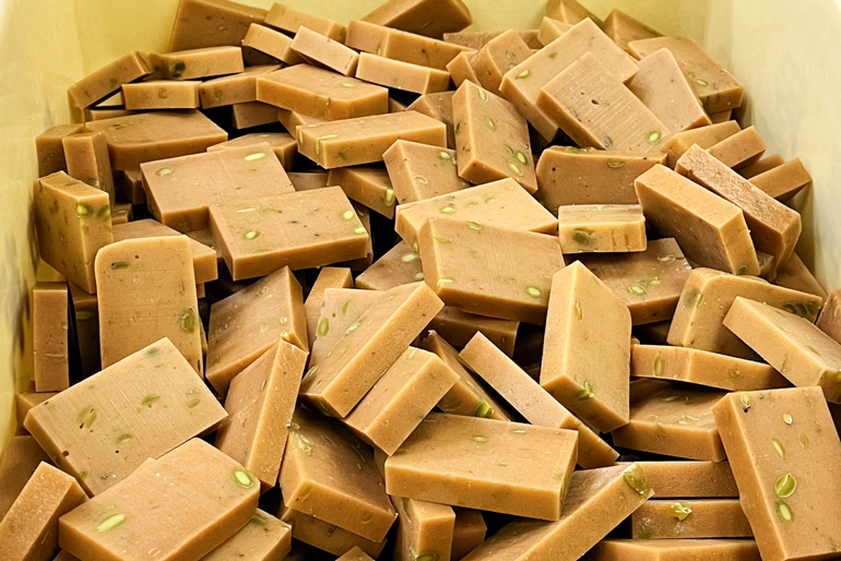 萬寿屋本舗のみそ餅は、原材料に山形県産のもち米「ひめのもち」を厳選して使用。もち米を丁寧につき上げ、自家製の味噌と砂糖を練り込んでいます。約4~5日かけてゆっくりと自然に冷やし固めることで、みそと米の風味が一体となった、もっちりとした食感の切り餅が完成。昔ながらの製造方法と味を受け継ぎ、変わらないおいしさをお届けします。