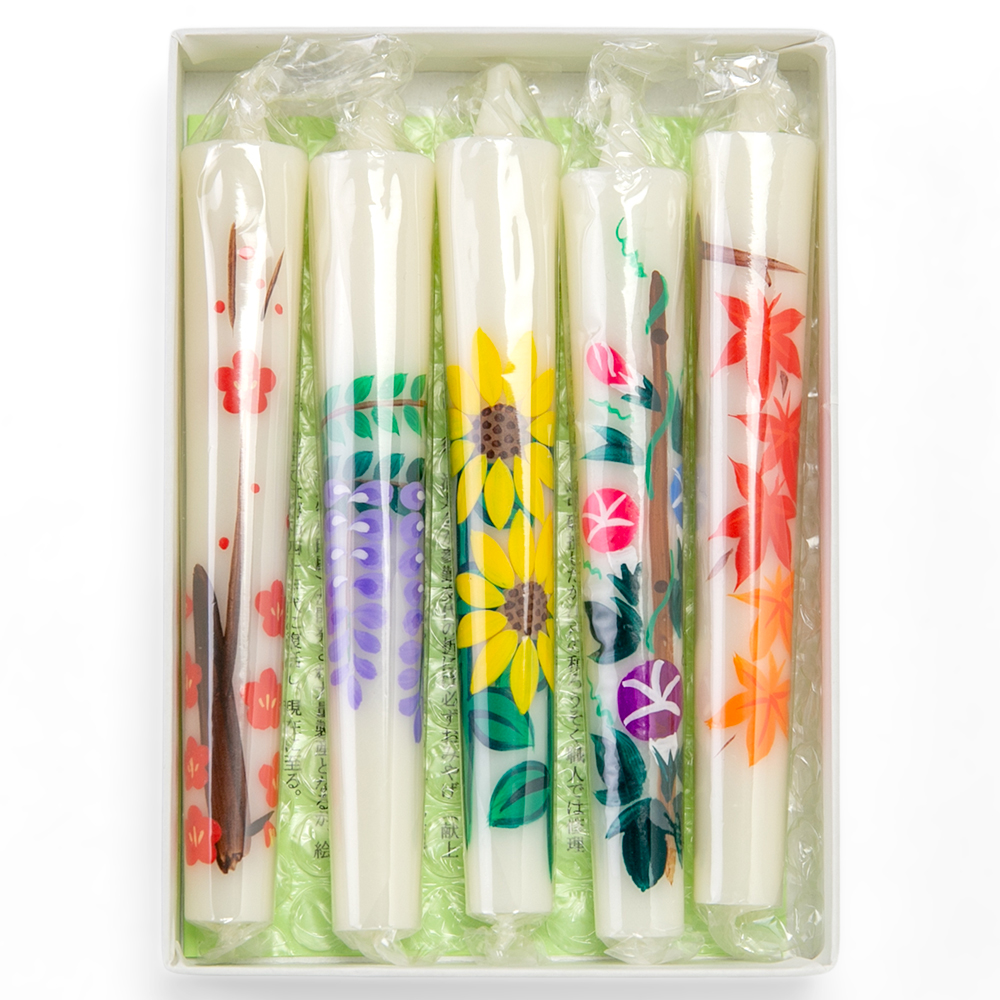 たっぷり楽しめる5号サイズの絵ろうそくセット。季節の花々の中から5種類を厳選しました。
