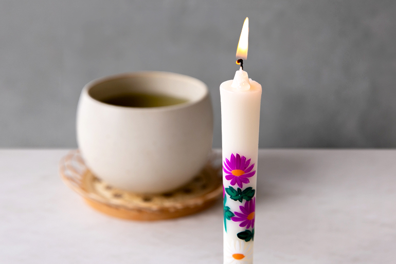 取材担当:加部華やかな絵柄が魅力の「手描き絵ろうそく」。キャンドルのように日常使いするのもオススメとのことなので、リラックスタイムに使ってみましたよ〜。