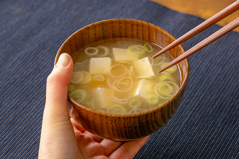 鍋で具材を軽く煮て、火を止めてから味噌を溶き入れたら完成です。お椀に盛って、いただきま〜す!ずずっ……。う〜ん、上品な香り。米麹のやさしい甘みが広がります。塩味には角がなく、とってもまろやかですね。豆腐やネギが持つ味わいを引き立てつつ、やさしく包み込んでくれています。はぁ〜、心まで温まりました!