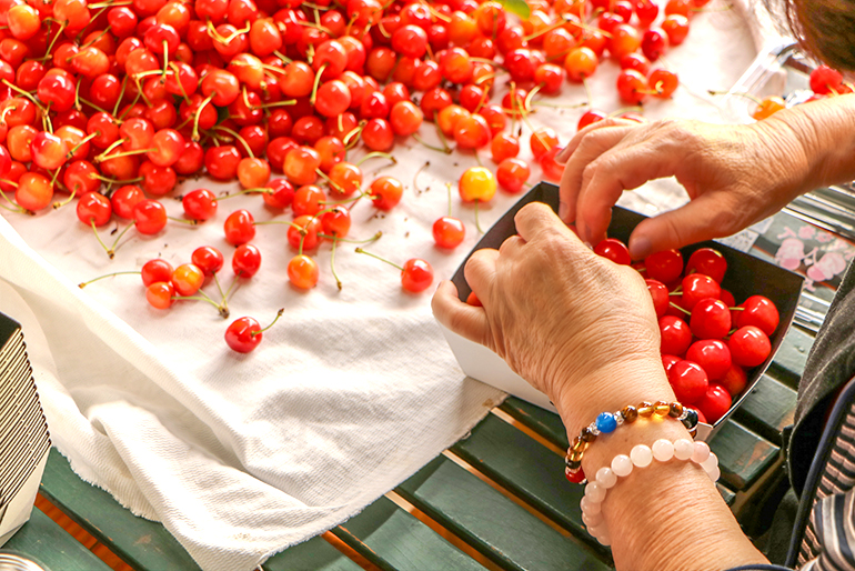 さくらんぼの生産が盛んな「果樹王国」として知られる東根市。昼夜の寒暖差や水捌けの良い土壌に恵まれた、果樹栽培に最適な地域だ。この地で代々続く果樹農家「栗原果樹園」は、さくらんぼをはじめ、桃、ラ・フランス、りんごなどを栽培している。4代目の栗原由樹さんは、理容師をしていたという異色の経歴を持つ。妻の実家である果樹園の手伝いをきっかけに、自然の中で作物を育てる面白さを実感して、2020年に就農。義理の両親や妻とともに、一年を通して旬の果物を全国に届けている。「理容師は、目の前のお客さんと会話しながら作品をつくる仕事です。農家は、自分の作品を全国のお客さんに届けられるのが良いなと思ったんです」と、栗原さんは語る。同園が大切にしていることは、お客さんとのコミュニケーション。「うちは、一年を通して果物を買ってくださるお客さんが多いんです。春・夏・秋・冬と、季節ごとに挨拶をするような感覚ですね。今年の栽培状況などをお話しながら、果物を届けています」と、栗原さん。また、SNSを通じた情報発信を積極的に行い、直接会えないお客さんにも果樹園の日常やつくり手の顔が見える取り組みにも力を入れている。
