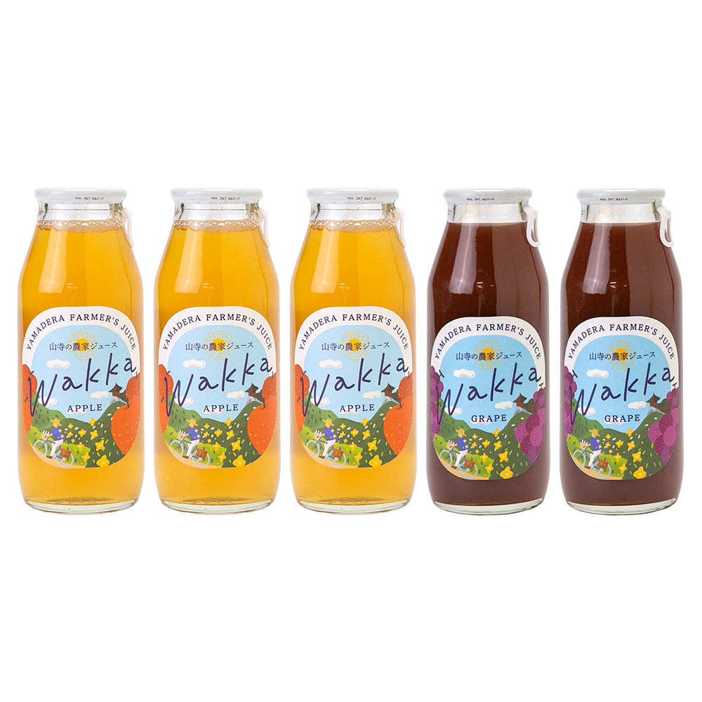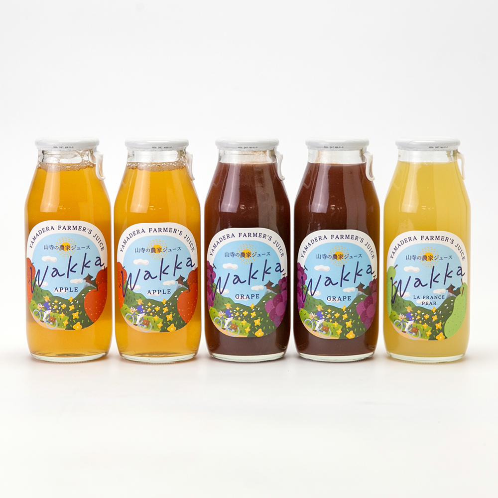 「Fruits Farm MURANAMI(フルーツファーム ムラナミ)」がある山形市山寺地区は、果樹栽培が盛んな地域です。5代目の村並さんが、地元を盛り上げようと同級生とともに作り上げたのが、果汁100%ジュース「wakka(わっか)」。果物だけを使った、強いコクとみずみずしさが自慢です。3種類をご用意しました。