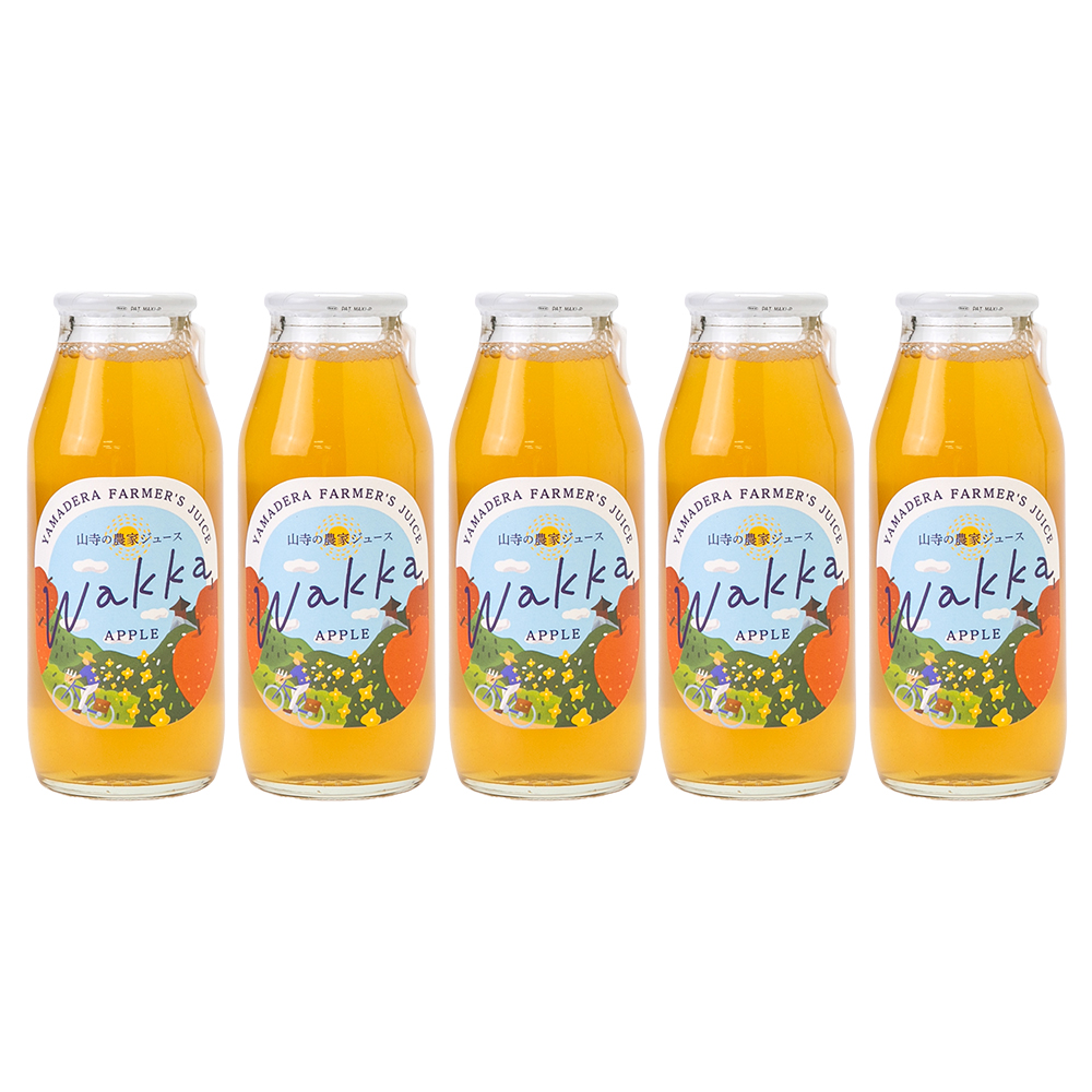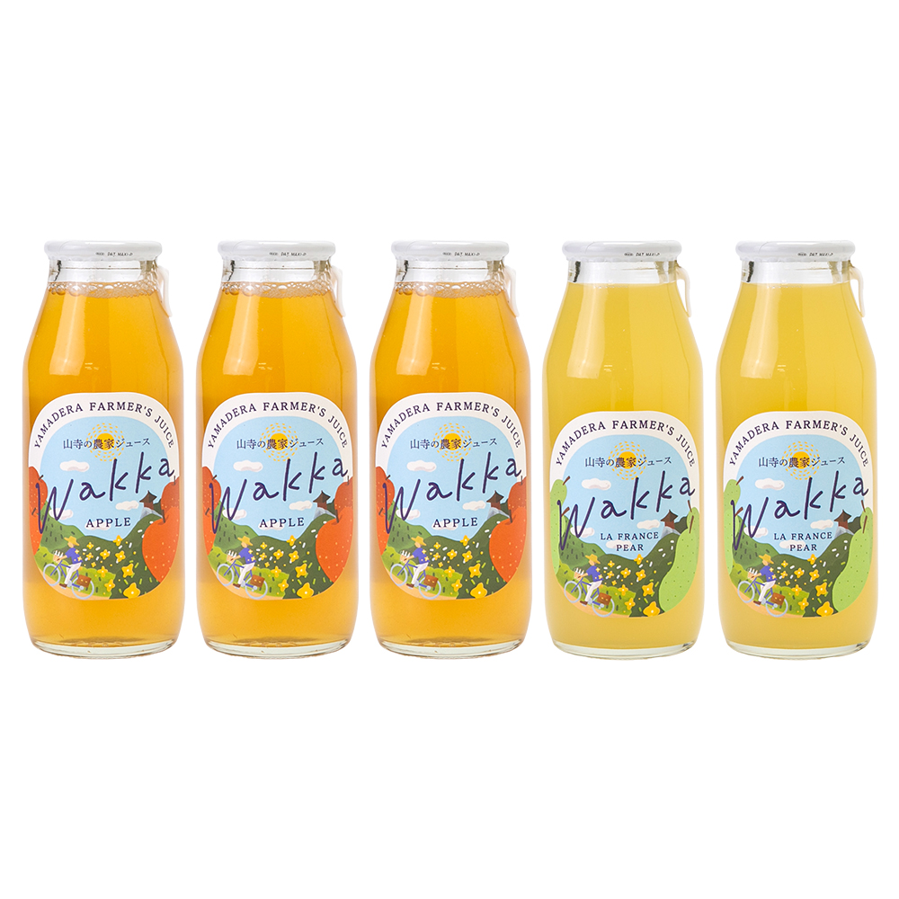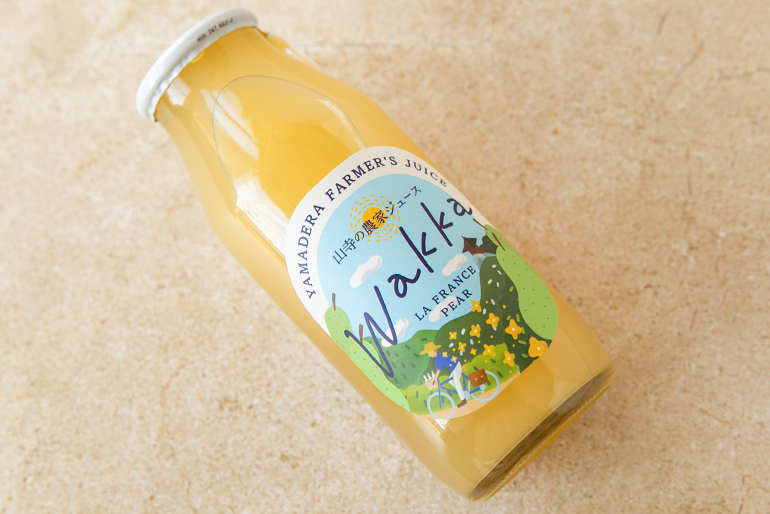 「Fruits Farm MURANAMI(フルーツファーム ムラナミ)」がある山形市山寺地区は、果樹栽培が盛んな地域です。5代目の村並さんが、地元を盛り上げようと同級生とともに作り上げたのが、果汁100%ジュース「wakka(わっか)」。名前には、「山寺をつなぎ、輪をつくる」という想いが込められています。果物のみを使ったジュースは、強いコクとみずみずしさが堪能できますよ。今回は、りんご、ぶどう、ラ・フランスの3種類をご用意。1本あたり180mlの飲み切りサイズなので、いつでも気軽に楽しめます。