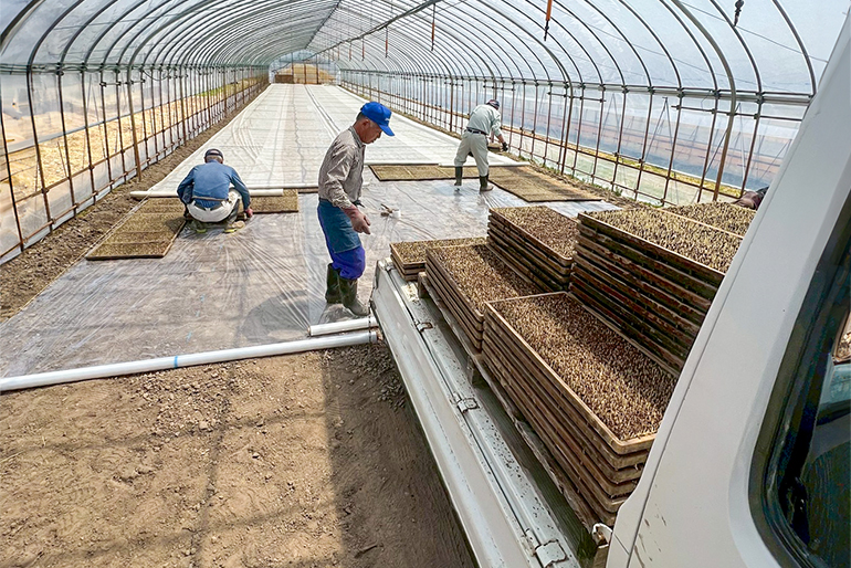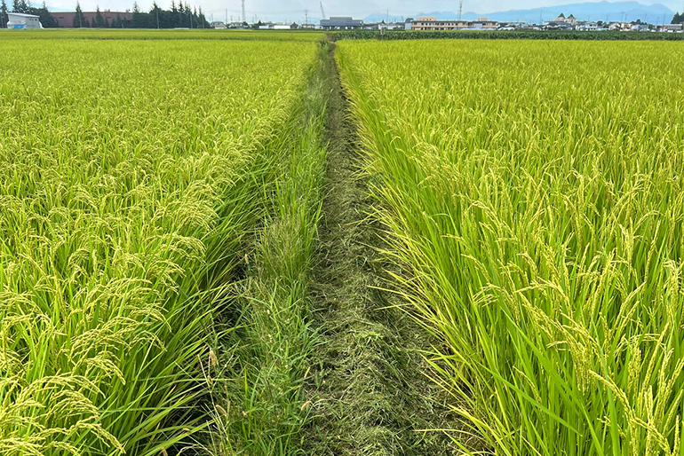 べにばなファームが目指すのは、農薬や化学肥料に頼らない、自然の力を活かした米づくりだ。自社で販売する食用米は、農薬や化学肥料の使用量を慣行栽培の5割以下に抑えた「特別栽培米」。慣行栽培の基準に比べ、農薬5割・化学肥料9割を削減している。「就農してから、全国で流通しているお米を調べたときに、特別栽培米の需要が高いことを知りました。これからも米農家としてやっていくなら、最低限そこはクリアしないといけないと思ったんです」と、渡邊さんは語る。そこで力を入れたのが、有機質肥料を使った土づくり。要となるのは、米ぬか・カニ殻・昆布などを独自配合した「ぼかし肥料」。これを秋の稲刈り後にすき込み、微生物の力で分解させることで、ミネラル豊富な土壌を作り上げている。また、近年の猛暑に対応し、田植え時期を調整する「適期栽培」を徹底。出穂後の登熟期が涼しい時期に重なるよう田植えを調整し、稲にじっくりと栄養を蓄えさせる。毎日田んぼへ足を運び、稲の顔色を観察しながら、その時々に最適な手入れを行う。自然のリズムに合わせて穏やかに完熟させることで、米本来の甘みと香りを最大限に引き出している。