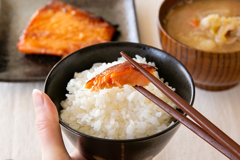 取材担当:廣川そのまま食べるのはもちろん、どんなジャンルのおかずとも相性が良い「コシヒカリ」。今回は、焼き鮭と味噌汁を用意して、朝ごはんにいただきます!