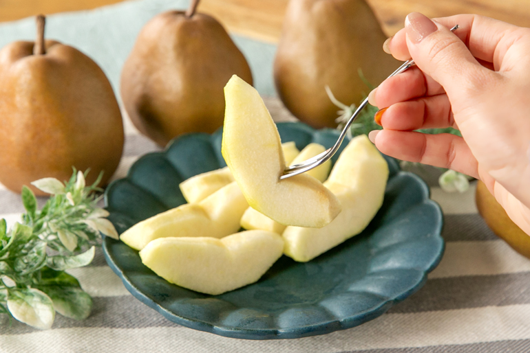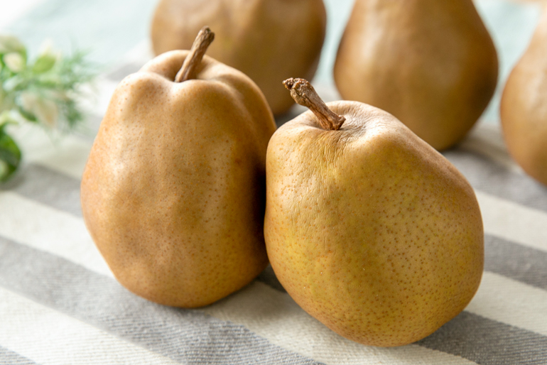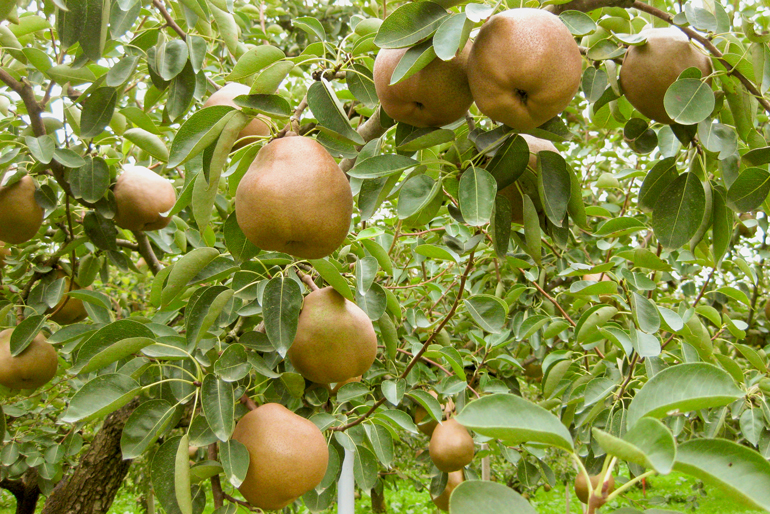 同園では、生産量が少なくあまり市場に出回らない「ゴールド ラ・フランス」を栽培している。「就農当初に『ゴールド ラ・フランス』を食べたら、『なんじゃこりゃあ~!うめええ』と、その美味しさの虜になりました。そのあとすぐに自分でも育てようと思ったんです」と、太田さんは笑う。通常のラ・フランスに比べ病気に弱い品種のため、枝の間隔を広く取り、風通しを良くすることがポイントだ。また、実の数をあえて少なくし、葉を多く残すことで、光合成を積極的に行えるようにしているそう。「ひとつひとつの実に甘みと香りが集まり、樹も長く健康に育ち続けます。収量よりも樹の一生を大切にしていますね」と、太田さん。初めて食べて以来、ゴールド ラ・フランスに惚れ込んでいる太田さんは、今もなおその美味しさを追求している。