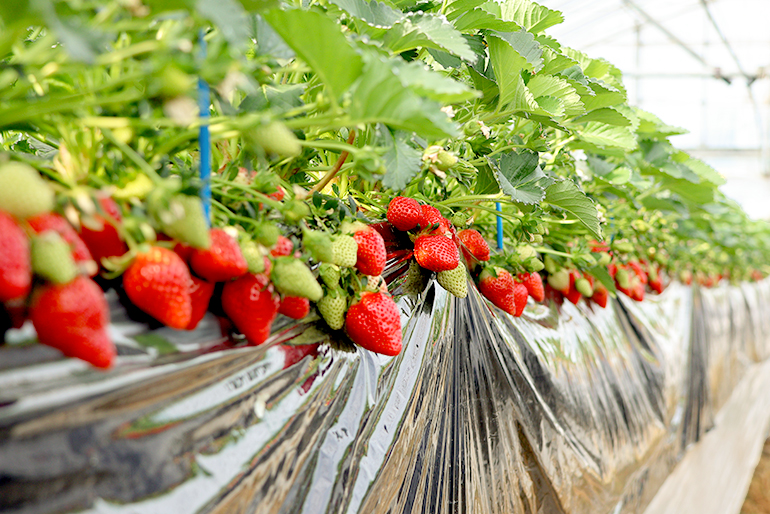 多くのファンを持つ、禄翔農園のいちご。美味しさの秘密の一つが、自然環境だ。河北町は、月山・朝日連峰などの雄大な山々に囲まれた土地。その雪解け水が濾過された清らかな地下水をたっぷりと与えることで、みずみずしいいちごに仕上がる。また、気温も影響しているという。「河北町の中でも、特にここ溝延(みぞのべ)地区は、昼夜の寒暖差が大きいんです。この寒暖差によって、一粒一粒に糖分が蓄えられ、美味しいいちごに育ちます」と、清野さんは教えてくれた。栽培にも、こだわりがある。特に力を入れているのが、苗作りだ。「1つの親苗から約100倍に子苗を育てるのですが、この子苗の品質が成長スピードや実の出来に影響します。苗作りが、いちご栽培の半分以上を占めると言っても過言ではありません」と、語る。もちろん、植え付け後の管理も抜かりない。「適切な時期に適切な作業をすることが大切です。例えばいちごは、ビニールをかけて温めることで、春になったことを知らせて実を付けさせます。こうしたタイミングを逃さないよう、きちんと準備します」と、清野さん。溝延地区の豊かな環境と手間を惜しまない栽培が、禄翔農園のいちごの美味しさを支えている。