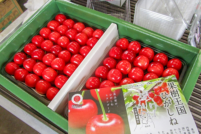 北村果樹園は、東根市神町にある果樹園。佐藤錦・紅さやか・ナポレオンなど、数品種のさくらんぼをメインに栽培している。東根市は、一年を通してさまざまな果物を楽しめる「果樹王国」。中でも同園のある神町は、さくらんぼ栽培にうってつけの土地だという。「水はけが良くて、はっきりとした寒暖差があります。さくらんぼが苦手とする雨もあまり降りません」と、代表の北村陽子さんは教えてくれた。そんな土地で、有機質肥料を使用して丁寧に育てる。栽培のポイントは「芽かき」。開花前のまだ寒さの残る時期に、花芽の数を2〜3割ほどに間引く、根気のいる作業だ。これにより、大粒で高品質なさくらんぼに仕上がる。その評判は口コミで広がり、全国各地から注文が入るようになったそうだ。また、観光果樹園としてさくらんぼ狩りも実施しており、シーズンには多くの観光客で賑わいを見せる。