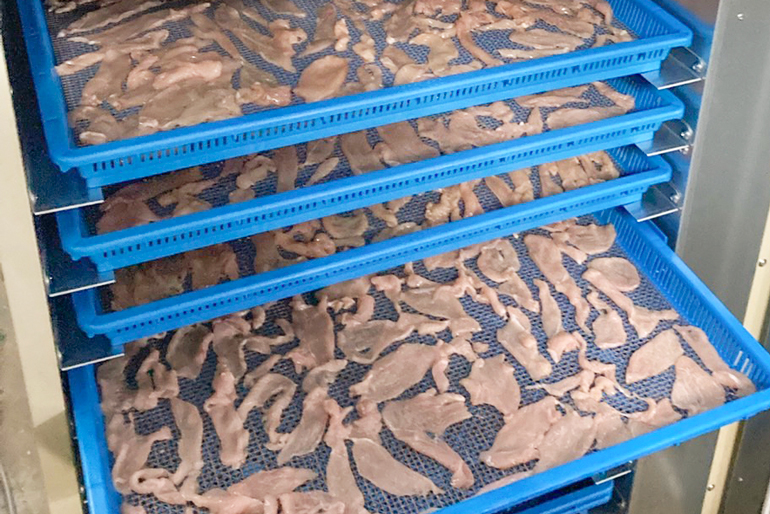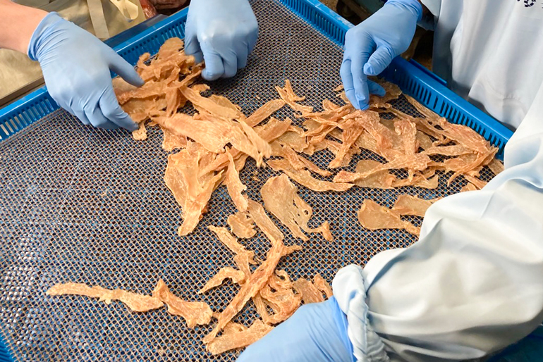 中島商店を経営する中嶋夫妻は、ともに獣医師免許を持つ異色の経歴の持ち主。人間用のチキンジャーキーを販売する中で寄せられた「ペット用はないのか」という顧客の声に応え、愛犬用おやつの開発に着手した。市販の大量生産されたペットフードには保存料などが含まれることが多い現状に対し、獣医師の観点から「家族同然のペットにもおいしく安全なものを」と一念発起。新たに専用の乾燥機を導入し、精肉店として厳選した新鮮な国産肉を、余計なものを一切加えず仕上げた「愛犬おやつ」を完成させた。精肉店ならではの確かな目利きと、獣医師としての深い愛情。その両方がたっぷりと詰まった安心のおやつは、愛犬家の間でたちまち評判を呼んでいる。