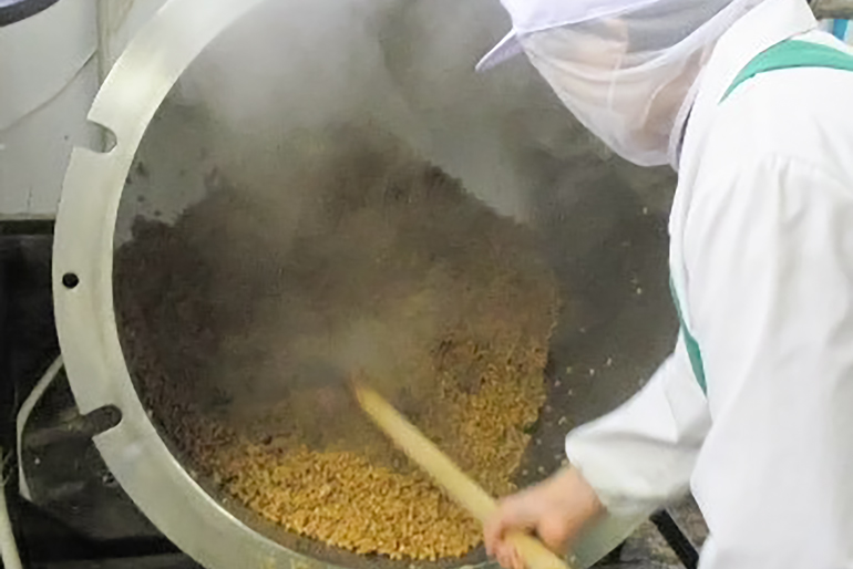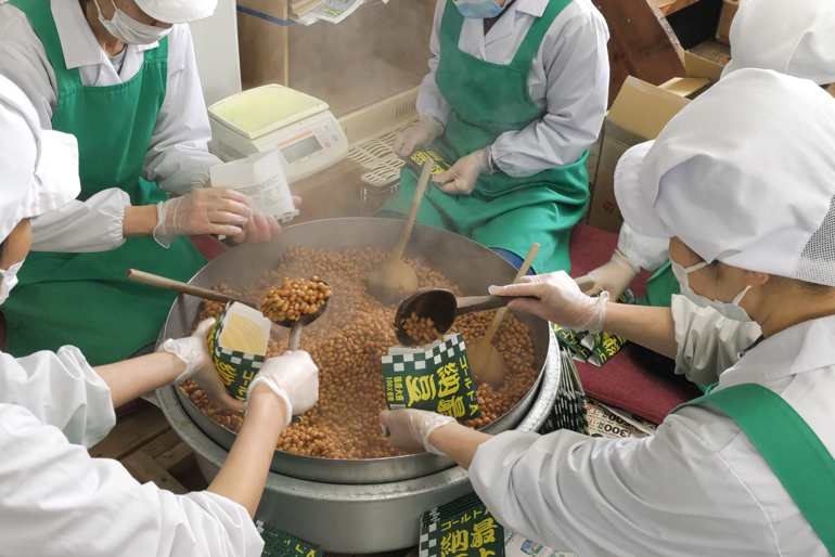 最上納豆の看板商品は、昔ながらの「経木(きょうぎ)」に包まれた納豆だ。赤松などの木材を薄く削った経木は、特有の香りが納豆に自然な風味を移すだけでなく、通気性に優れているため発酵状態を適度に保つ役割も果たす。原料には、山形県産「タチユタカ」をはじめとする厳選した国産大豆を使用。じっくりと時間をかけた長期低温浸漬により、大豆の芯までふっくらと柔らかく煮立てる。紙と経木で包み込み、完熟発酵させることで、大粒ながらも柔らかな食感と、大豆の力強い旨みを持つ納豆が生み出される。1995(平成7)年には全国納豆品質鑑評会で「最優秀賞」を受賞するなど、その品質は折り紙付きだ。